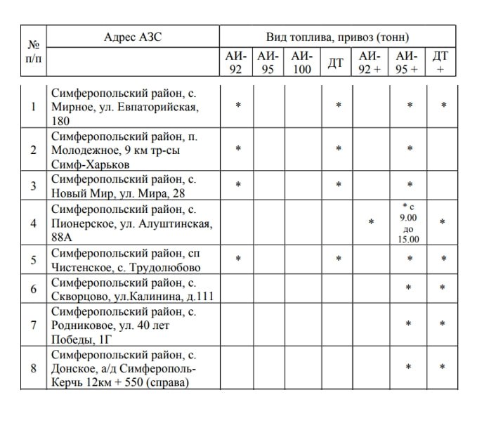 Публикуем информацию о наличии топлива на автозаправочных станциях расположенных на территории Симферопольского района реализуемого за наличный расчет.