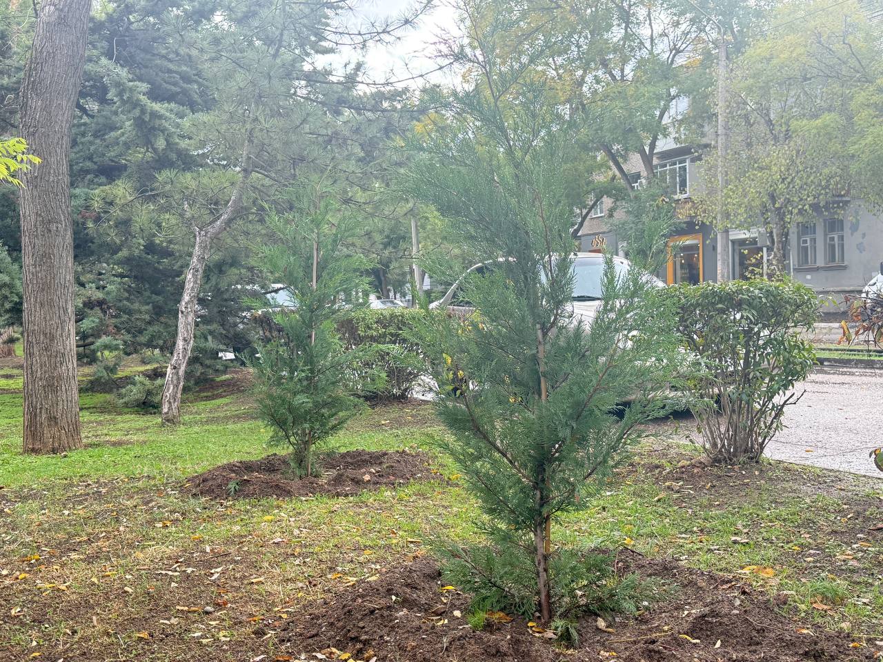 На данный момент специалистами МУП «МО «Комбинат благоустройства» высажены деревья и кустарники на ул. Фрунзе. В их числе кипарисы, можжевельники и другие хвойные растения, которые будут радовать нас своей зеленью зимой и летом.