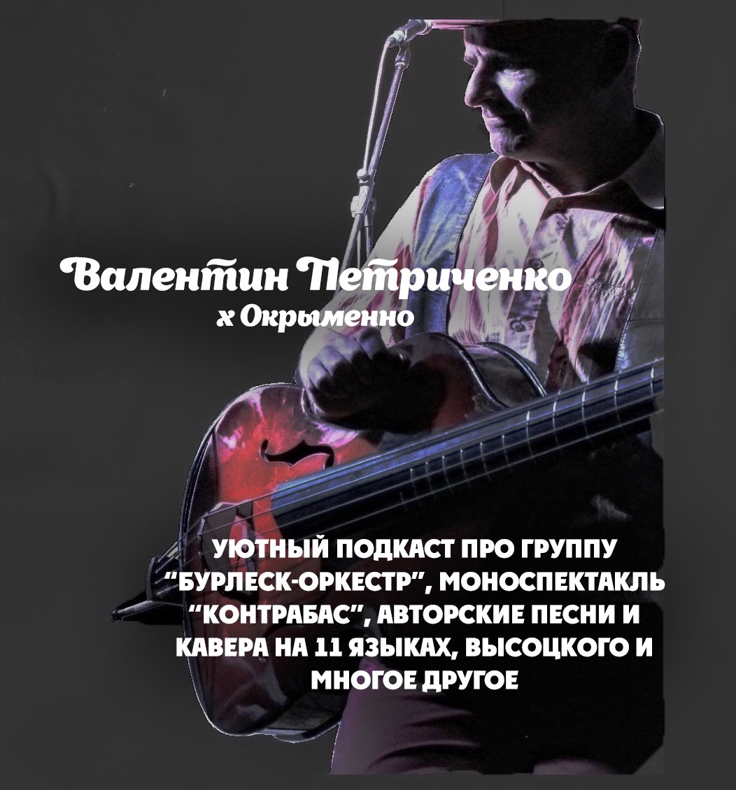 Уютный подкаст с Валентином Петриченко про группу “Бурлеск-Оркестр”, моноспектакль “Контрабас”, авторские песни и кавера на 11 языках, творчество Высоцкого и многое другое. Слушайте, ставьте лайки, делайте репосты и всё будет ОКРЫМЕННО.