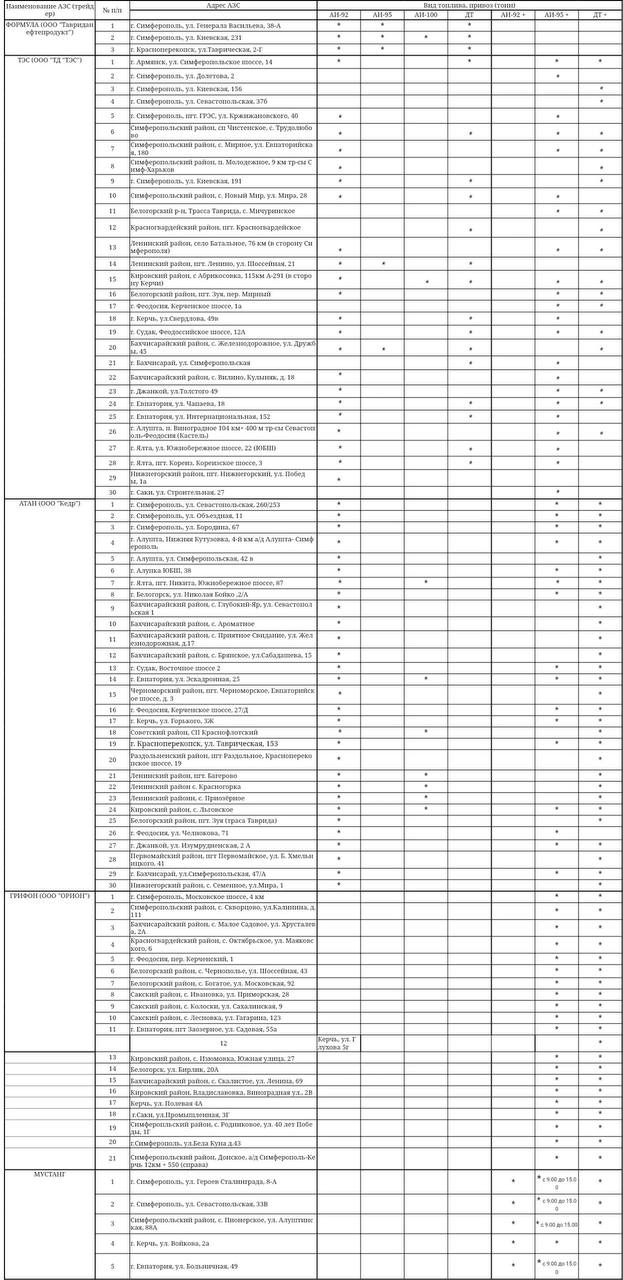 Перечень адресов АЗС, где имеется топливо в свободной продаже