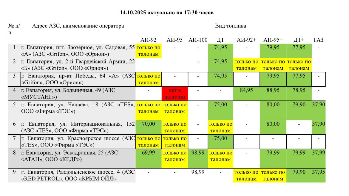 Публикуем данные о наличии топлива на АЗС Евпатории.