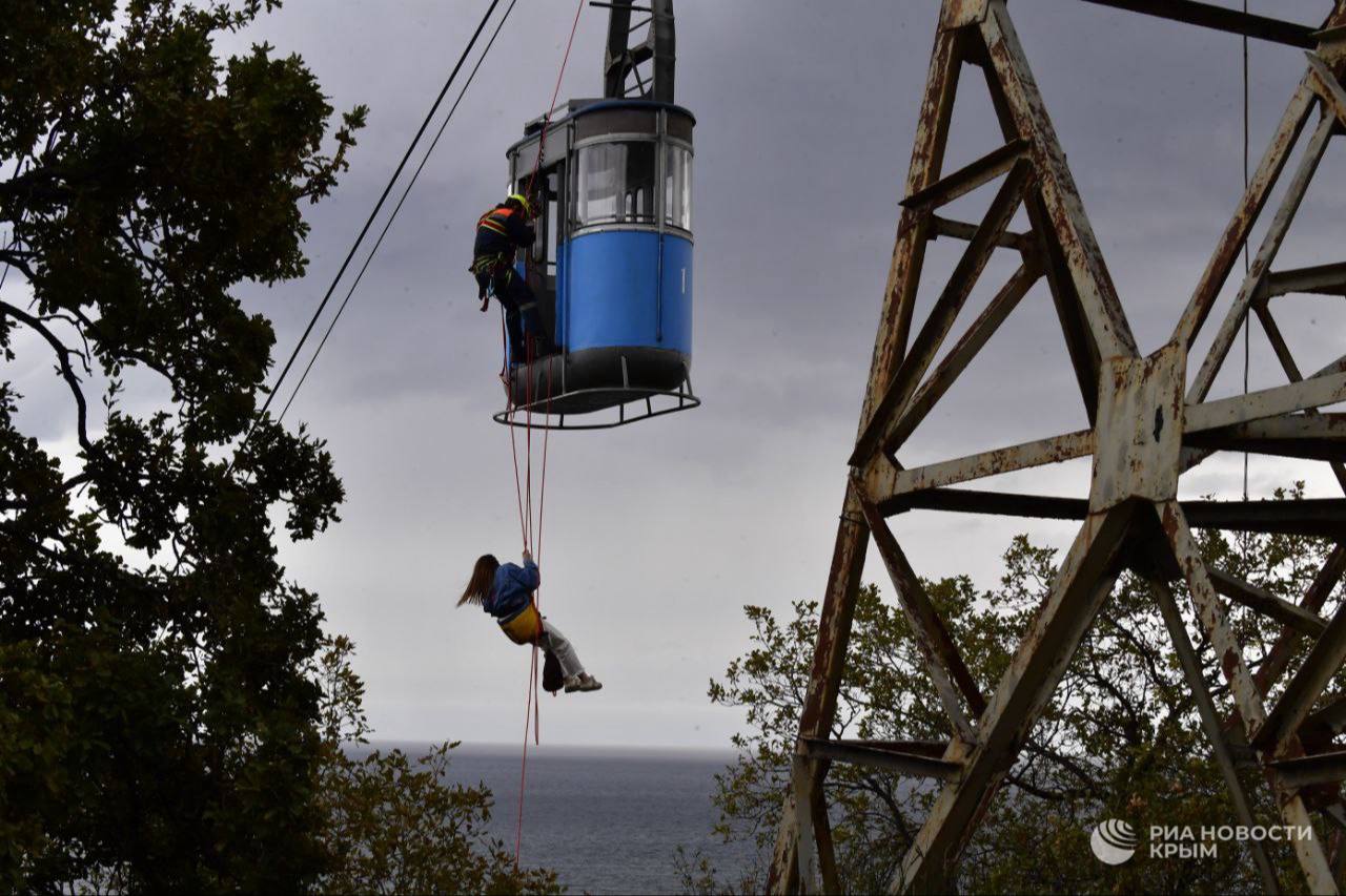 Крымские спасатели тренировались спасать людей из застрявшей кабины канатной дороги.