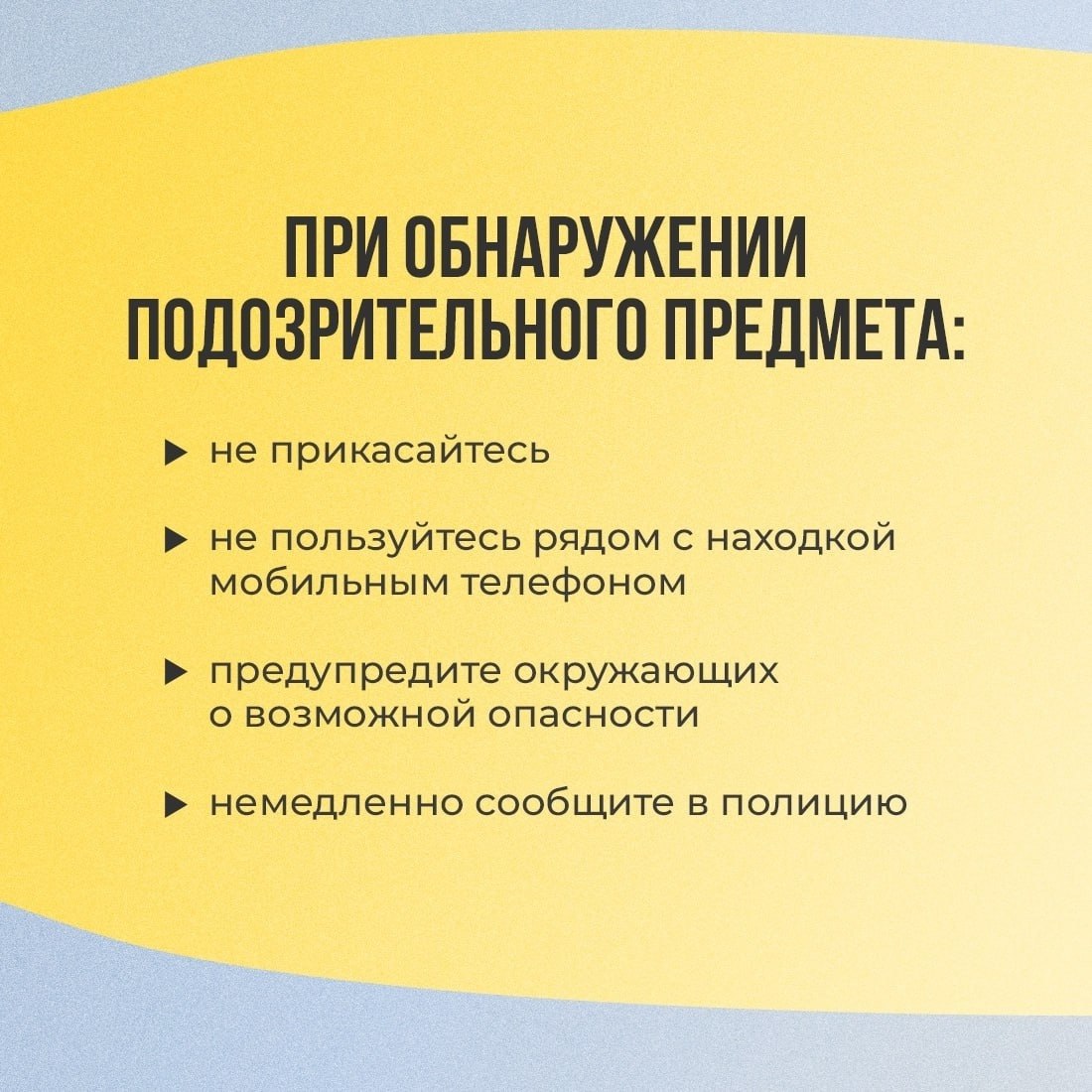 Обо всех подозрительных ситуациях незамедлительно сообщайте сотрудникам правоохранительных органов, оказывайте им необходимое содействие.