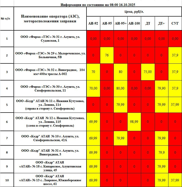 Уважаемые алуштинцы! Важная информация о наличии топлива в нашем муниципалитете по состоянию на 08:00 16.10.2025.
