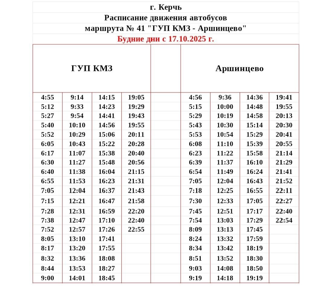 С 17.10.2025 г. в ТЕСТОВОМ режиме будет изменено расписание движения автобусов на муниципальном маршруте регулярных перевозок № 41 «ГУП КМЗ – Аршинцево – Горпляж (в летний купальный сезон)» (в будние дни).