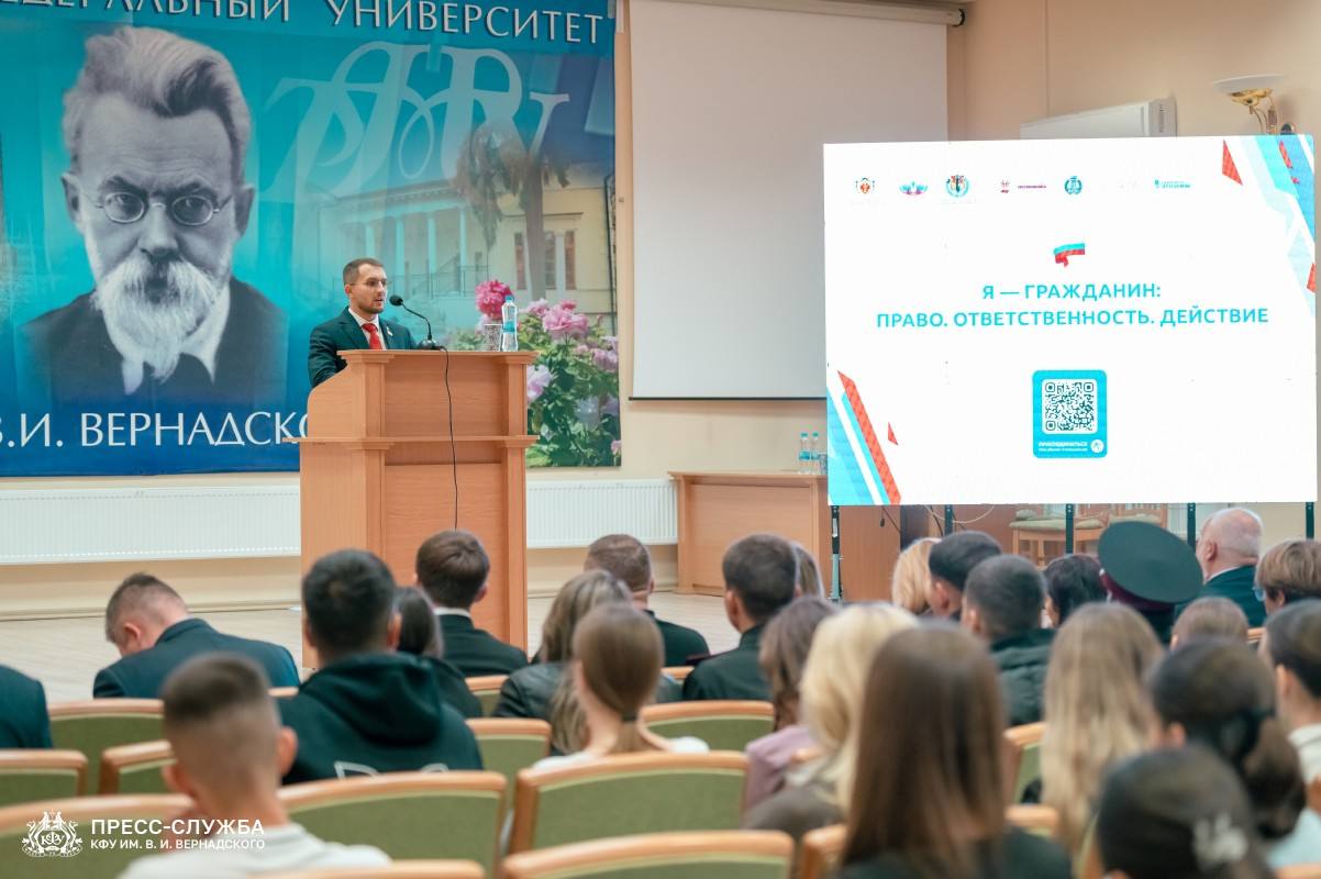 В КФУ им. В.И. Вернадского стартовал патриотический проект «Я – гражданин: Право. Ответственность. Действие». Студентам рассказали о конституционных правах и последствиях повседневных действий, в частности касающихся сфер шпионажа и экстремизма.