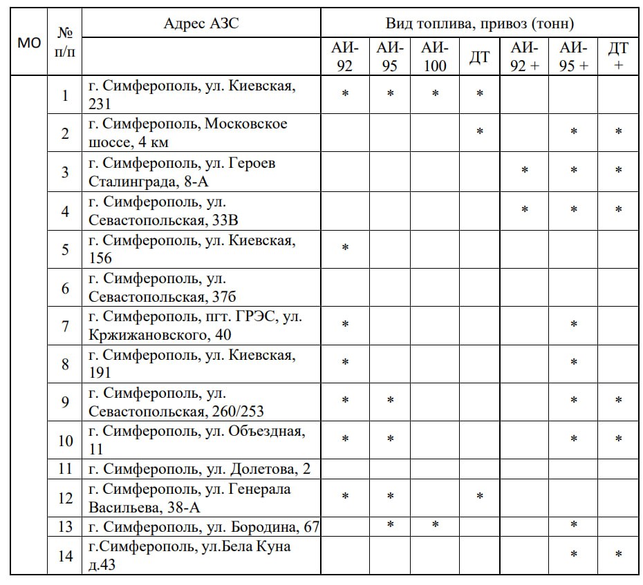 Актуальный перечень адресов АЗС в городе Симферополе, где имеется топливо в свободной продаже (*Данные актуальны на 17.10.2025 года 08:00)