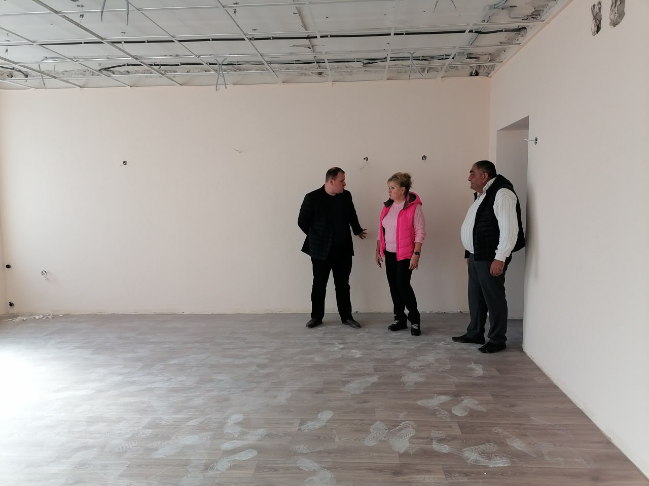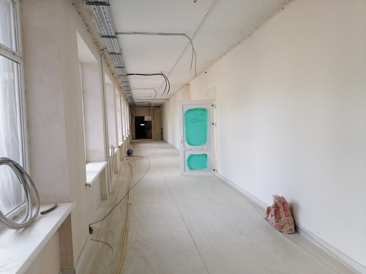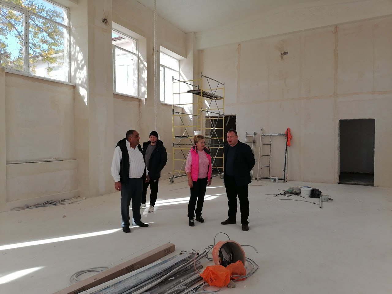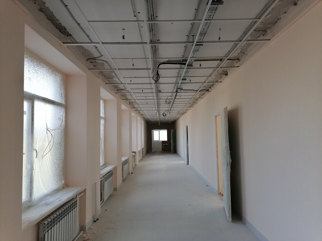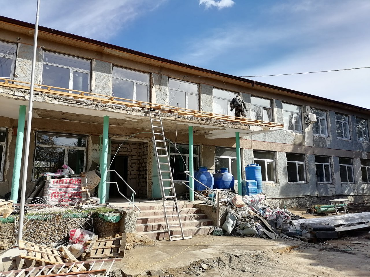 В настоящее время подрядная организация заканчивает работы по утеплению, штукатурке и покраске фасада школы, ремонту козырька над входом в здание и залитию отмостки, выполнены работы по выравниваю полов школе. Ведется штукатурка стен спортивного зала, укладывается плитка в санитарных узлах и пищеблоке, начаты работы по окрашеванию стен и укладке линолеума в учебных кабинетах.