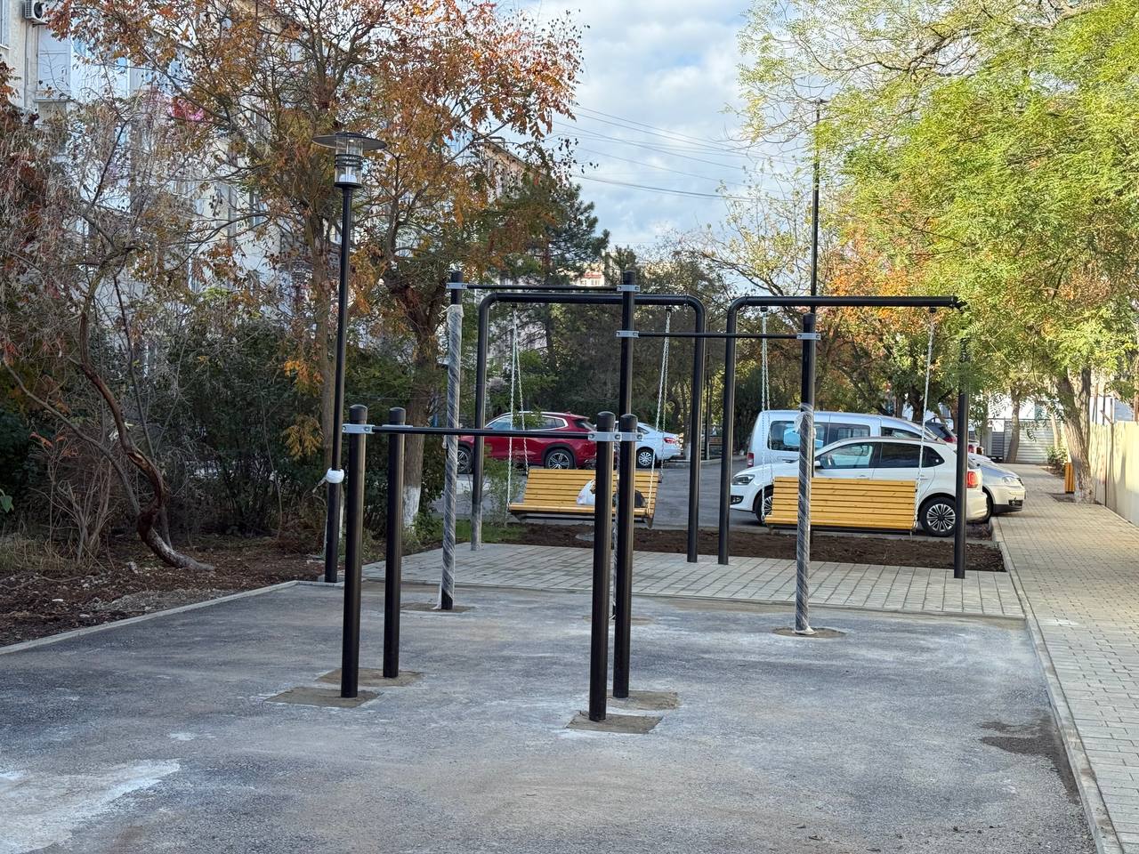 На пр. Победы, 20 в полном объёме выполнено асфальтирование, уложена тротуарная плитка, установлены малые архитектурные формы. Сегодня на детской и спортивной площадке появится второй слой резинового покрытия, после чего будет завершён монтаж спортивных тренажёров. Уже подключено наружное освещение.