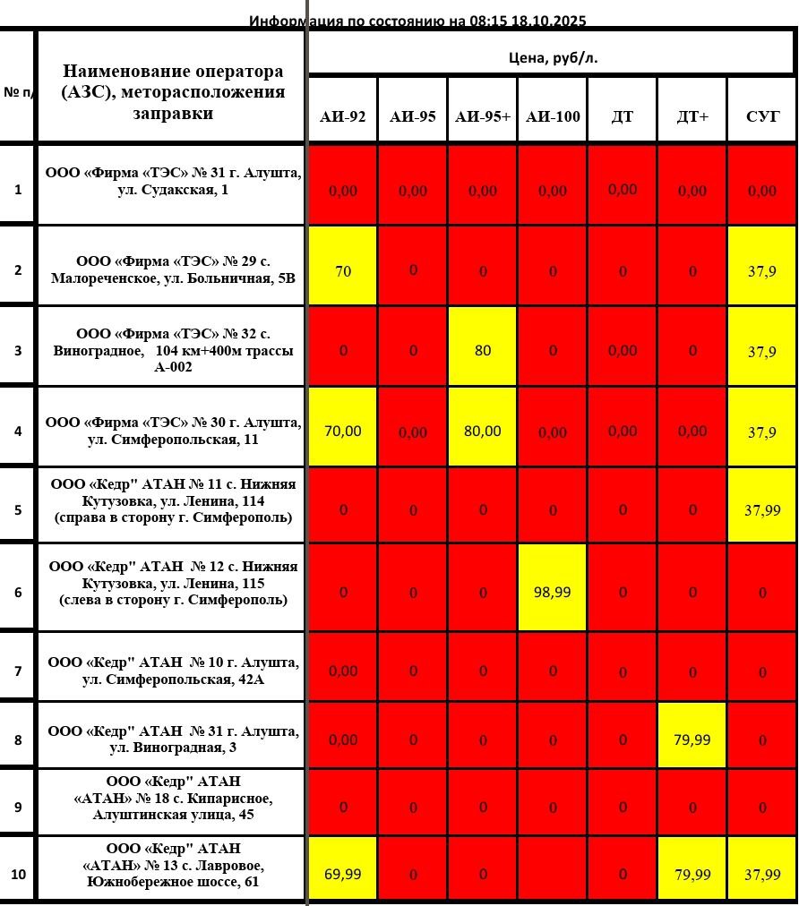 Уважаемые алуштинцы! Важная информация о наличии топлива в нашем муниципалитете по состоянию на 08:15 18.10.2025.