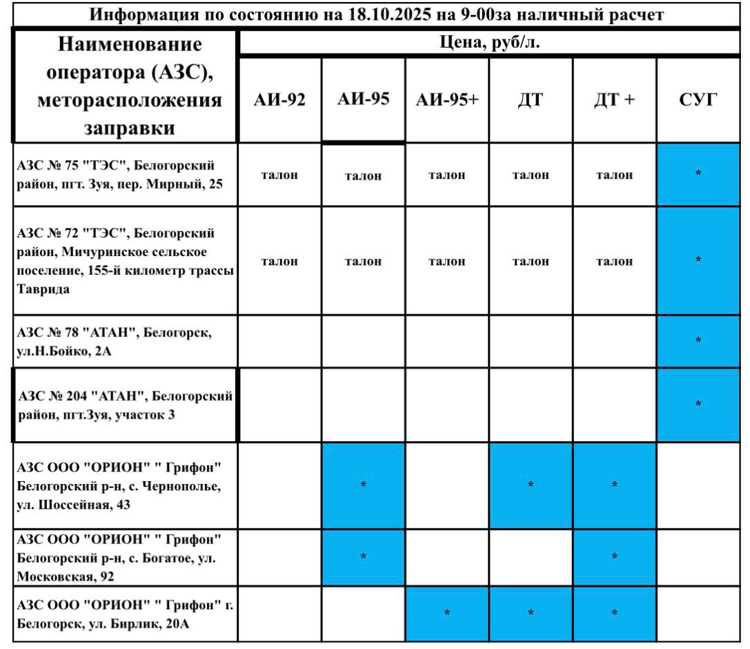 Актуальная информация по наличию топлива на АЗС в Белогорском районе по состоянию на 09.00 18 октября.