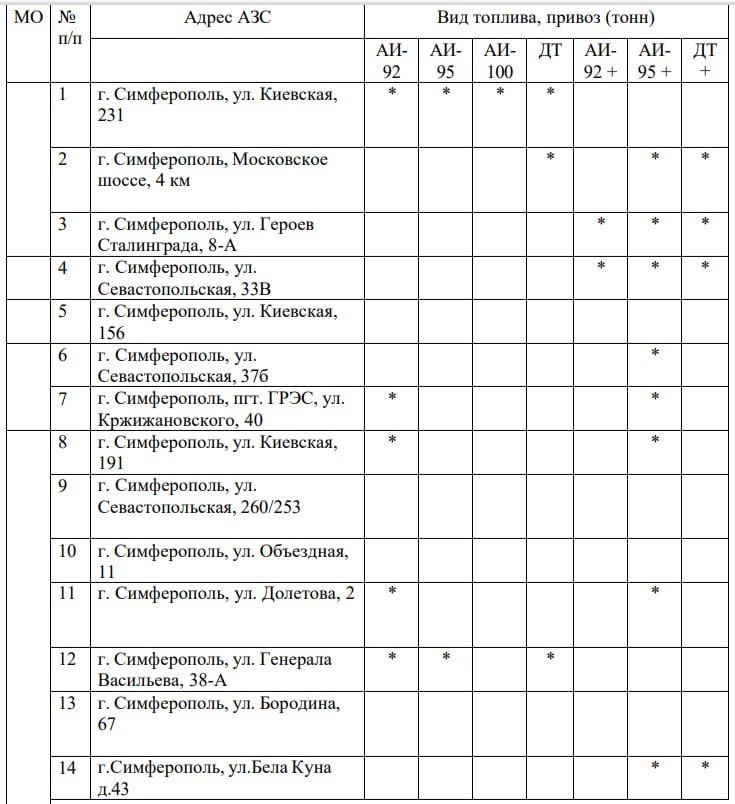 Актуальный перечень адресов АЗС в городе Симферополе, где имеется топливо в свободной продаже (*Данные актуальны на 18.10.2025 года 08:00)