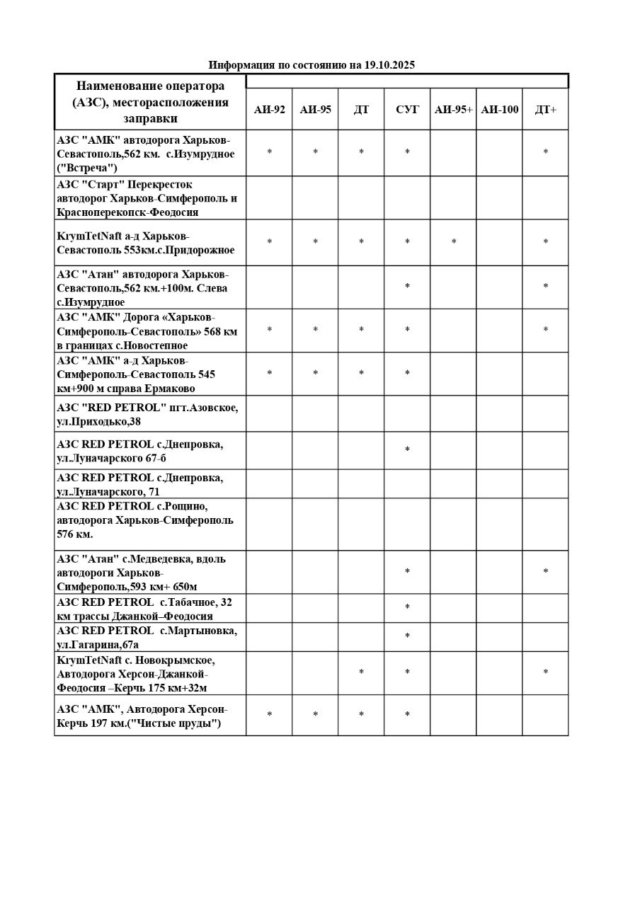 Делюсь с вами актуальной информацией о наличии топлива на АЗС Джанкойского района по состоянию на 19.10.2025 на 09:00