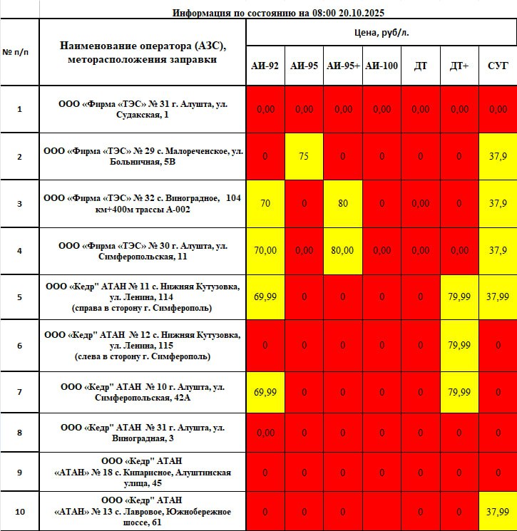 Уважаемые алуштинцы! Важная информация о наличии топлива в нашем муниципалитете по состоянию на 08:00 20.10.2025.