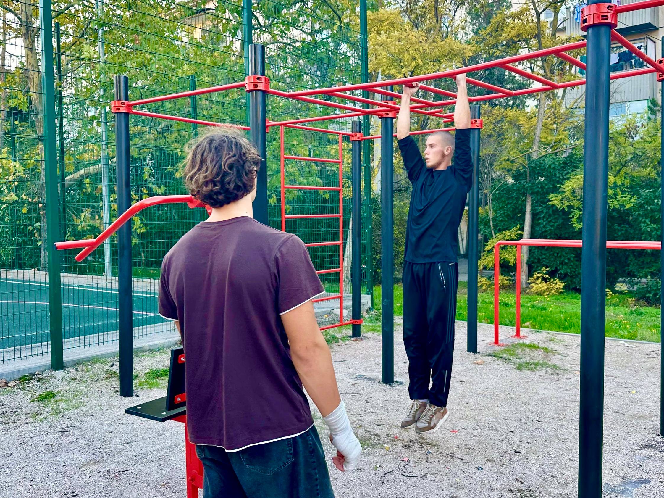 Спортивный объект включает футбольно-баскетбольное поле и площадку с тренажёрами.