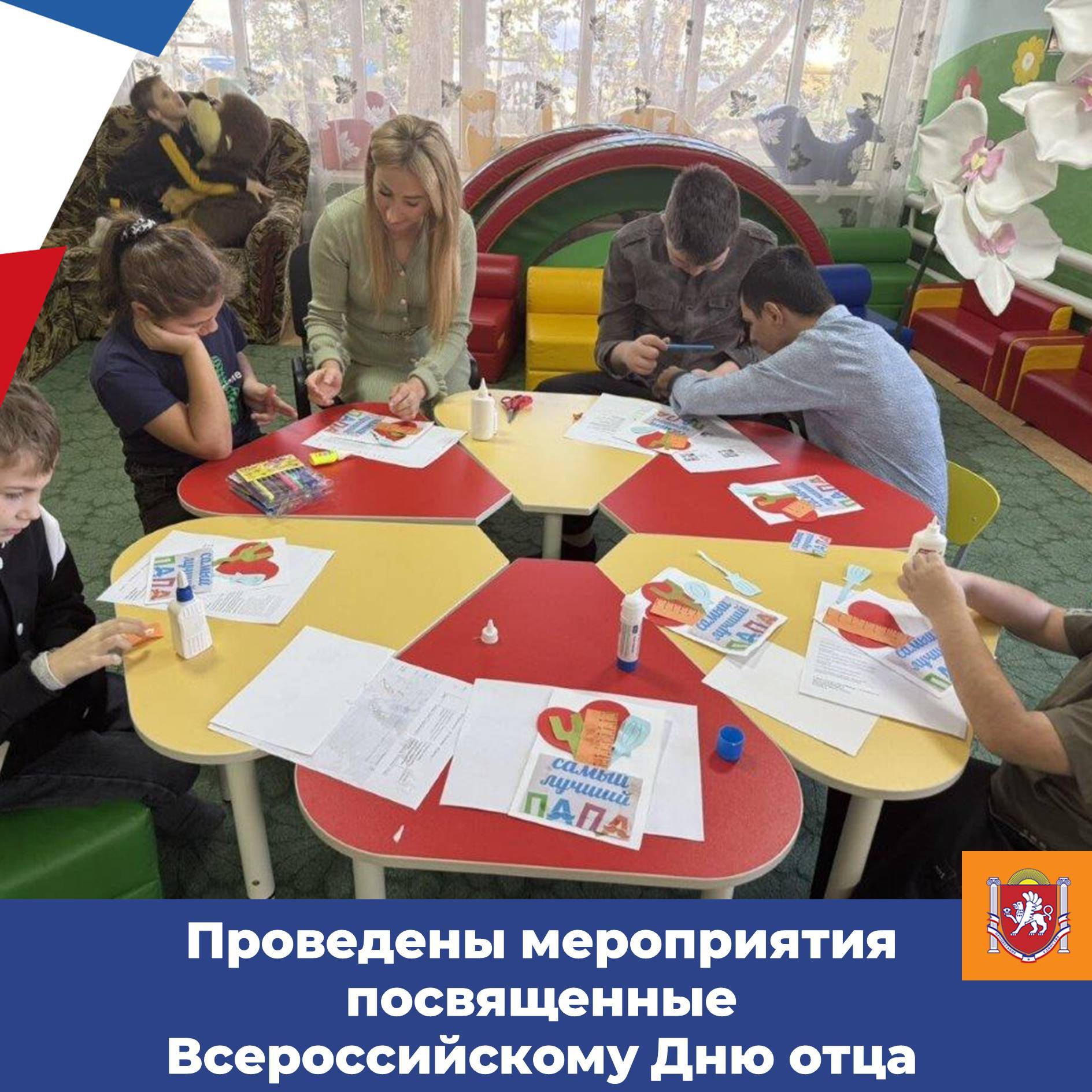 В учреждениях социального обслуживания, отнесенных к Министерству труда и социальной защиты Республики Крым, проведены ряд мероприятий, посвященных празднованию Всероссийского Дня отца. Для отцов детей, посещающих социально-реабилитационные отделения для детей-инвалидов, были организованы праздничные выступления, интересные программы, викторины и конкурсы, спортивные состязания, фотовыставки. Организованы творческие мастерские «Подарок папе». Дети с радостью создавали для своих пап красочные поздравительные открытки. Также дети рисовали портреты своих отцов и подарили их папам в день праздника.