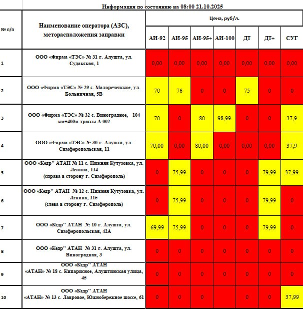 Уважаемые алуштинцы! Важная информация о наличии топлива в нашем муниципалитете по состоянию на 08:00 21.10.2025.