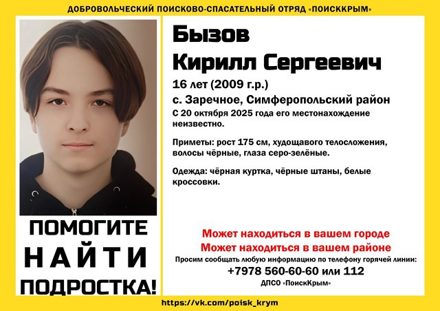 С 20 октября не выходит на связь 16-летний Кирилл Бызов. Подросток проживает в селе Заречное Симферопольского района, его местонахождение на данный момент неизвестно. Об этом сообщили волонтеры «ПоискКрым».