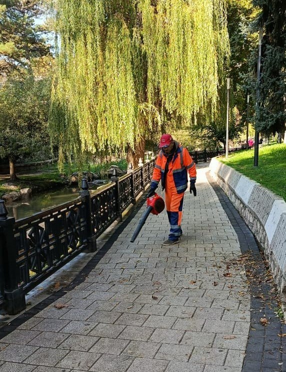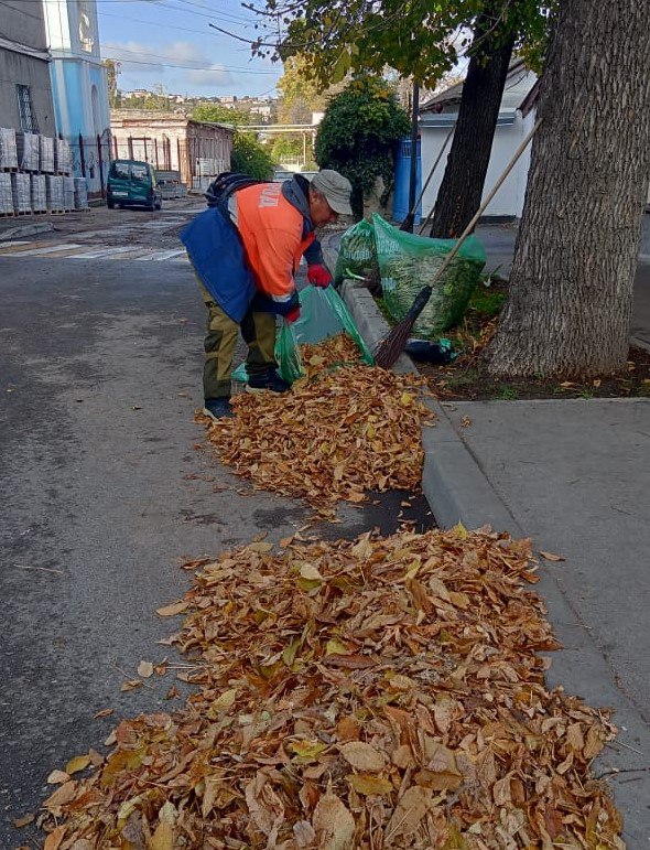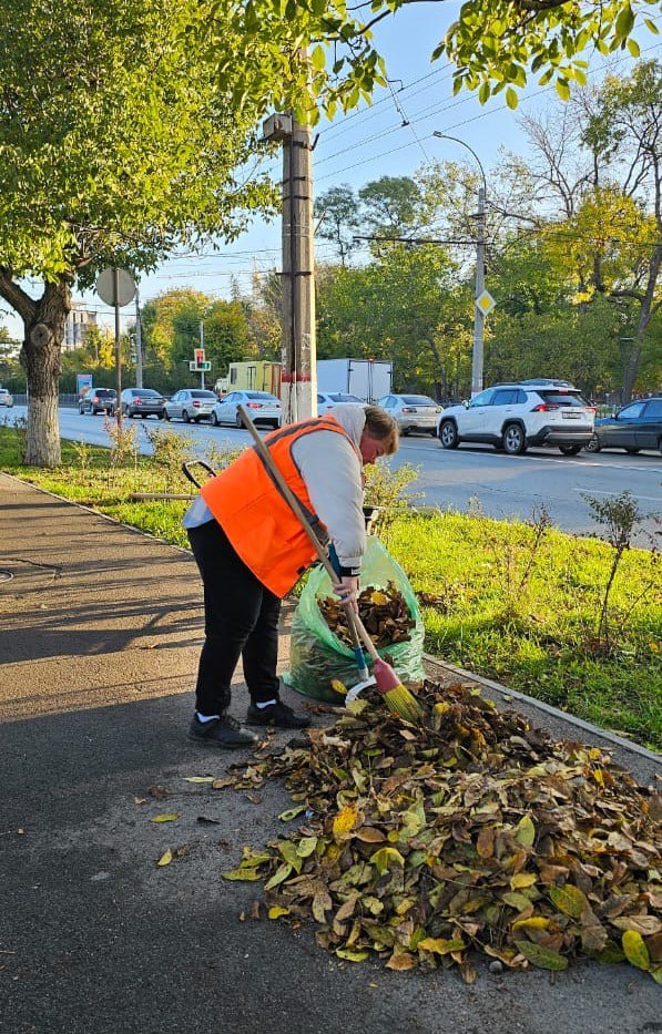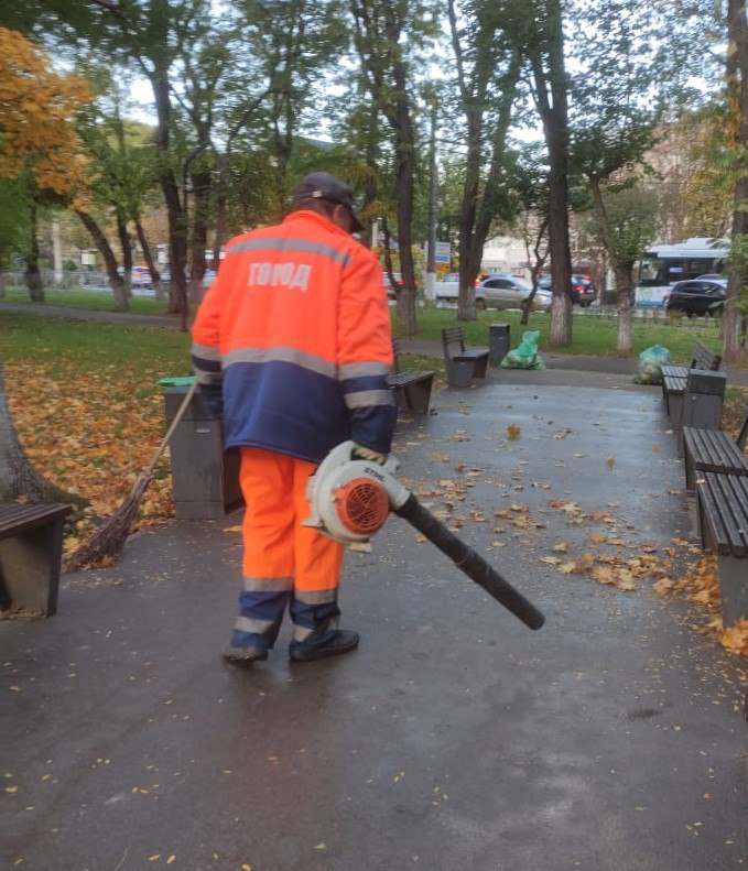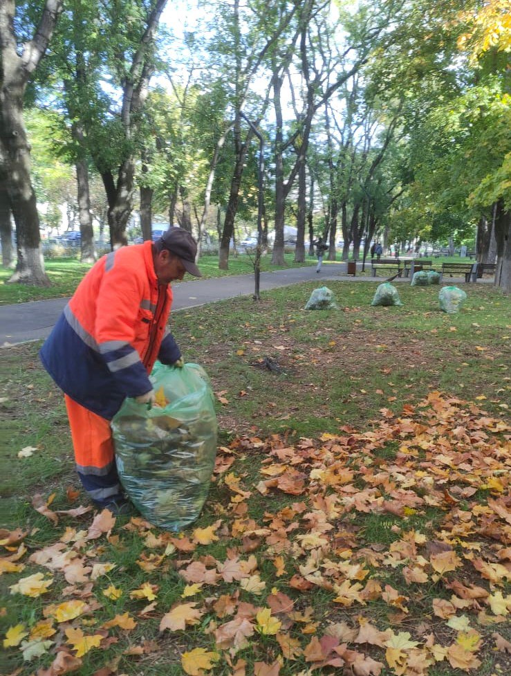 Активно продолжаются работы по уборке листвы и сухих ветвей. Всего в санитарной очистке городских территорий задействовано более 400 человек.