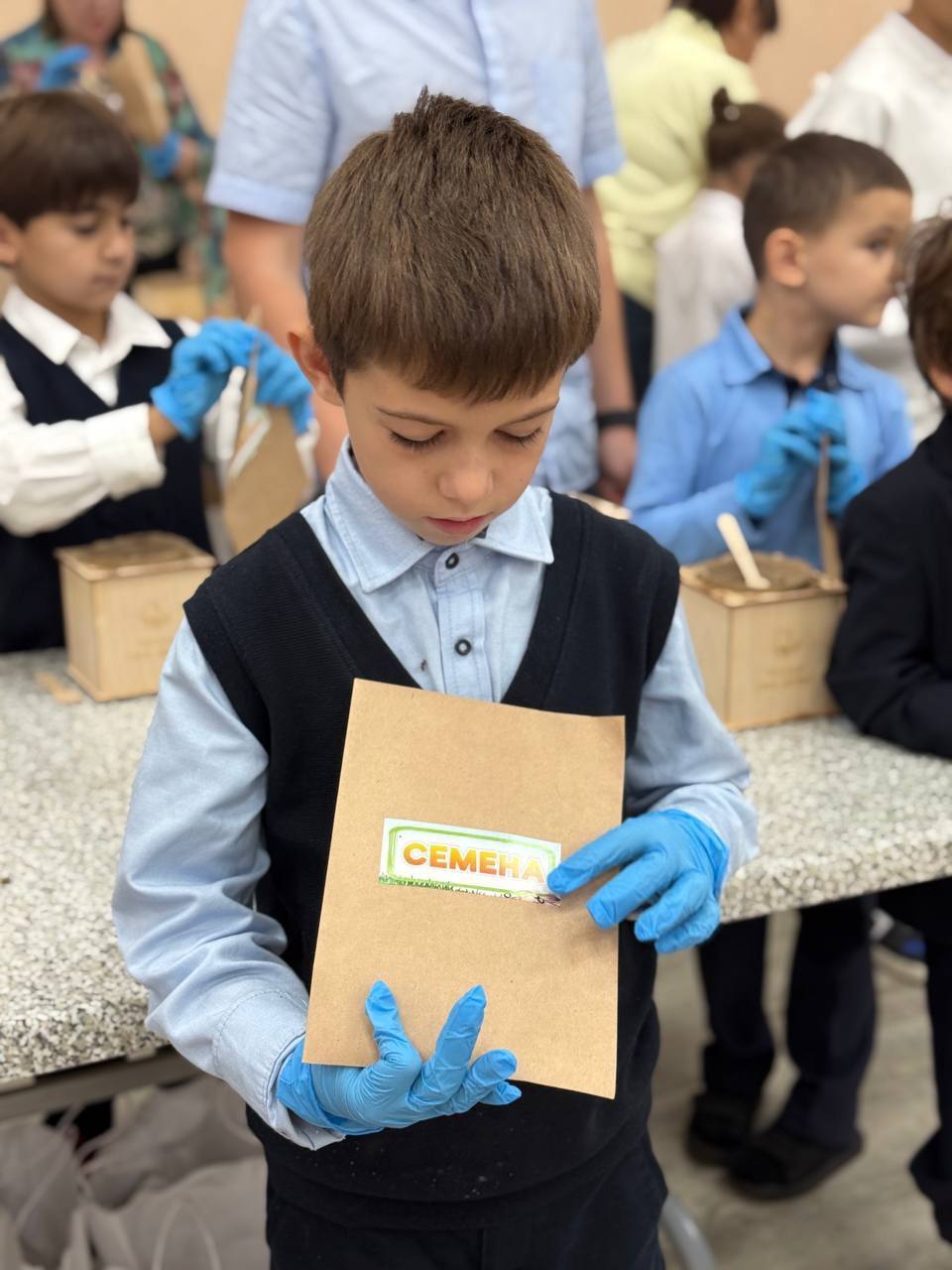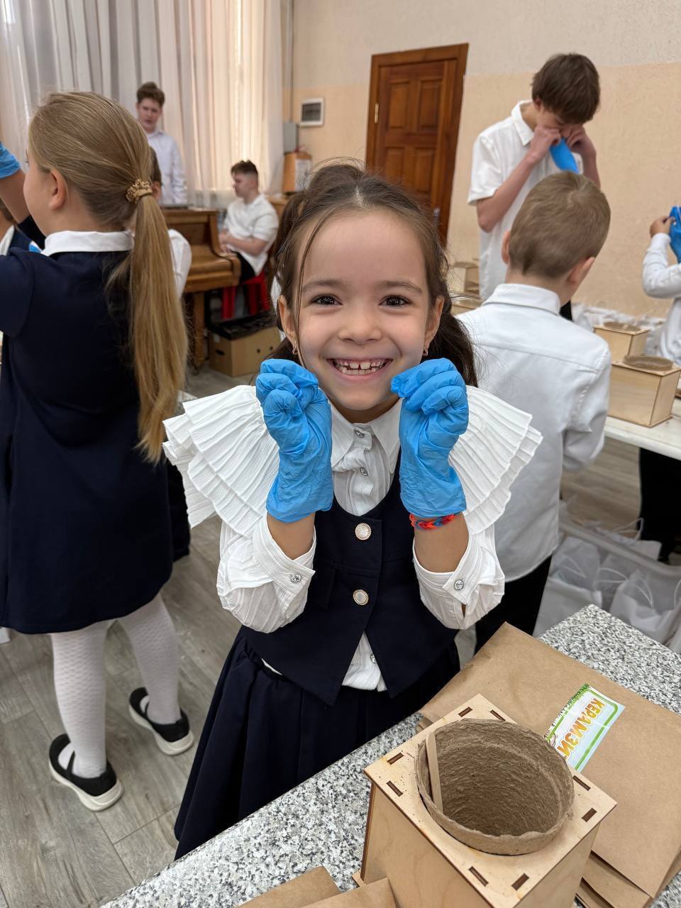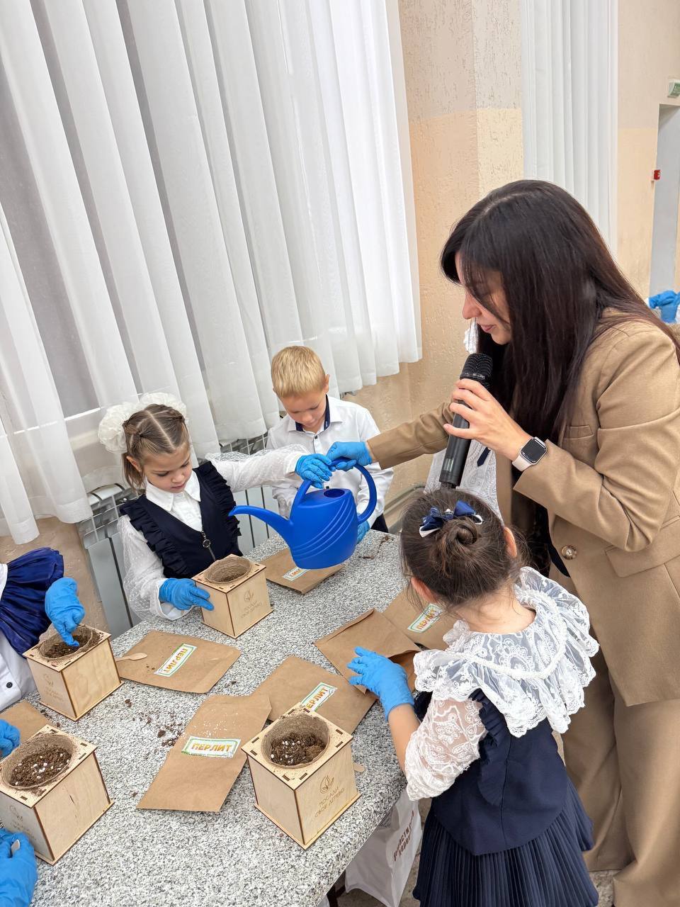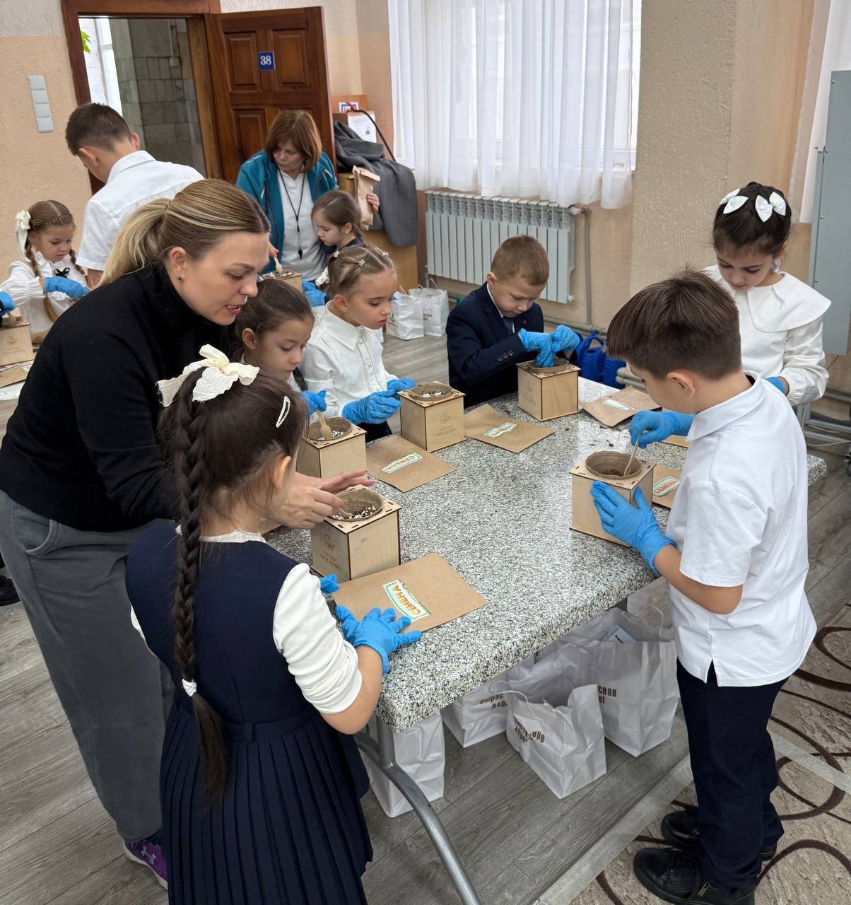 НАШ СПЕЦИАЛЬНЫЙ НАБОР - каждый первоклассник получил горшочек, перчатки, ложечку, пакетики с керамзитом, грунтом, перлитом и семенами.
