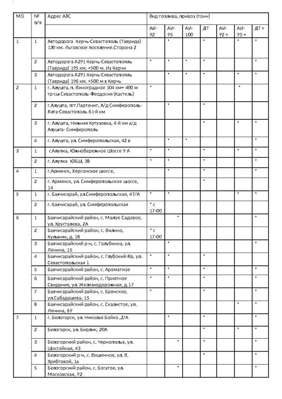 Публикую актуальную информацию о наличии топлива на автозаправочных станциях Республики Крым по состоянию на 22.10.2025 года.