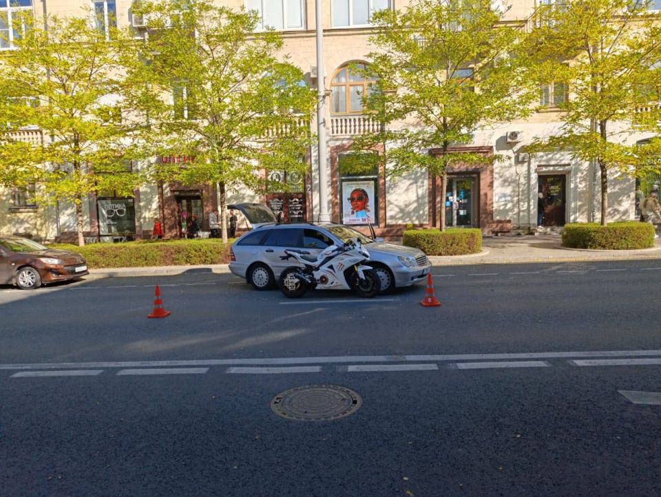 Авария произошла на улице Большая Морская, сообщили в Госавтоинспекции города. 25-летний водитель мопеда перестраивался из средней полосы в левую и не убедился в безопасности манёвра, после чего врезался в Mercedes, который в этот момент парковали.