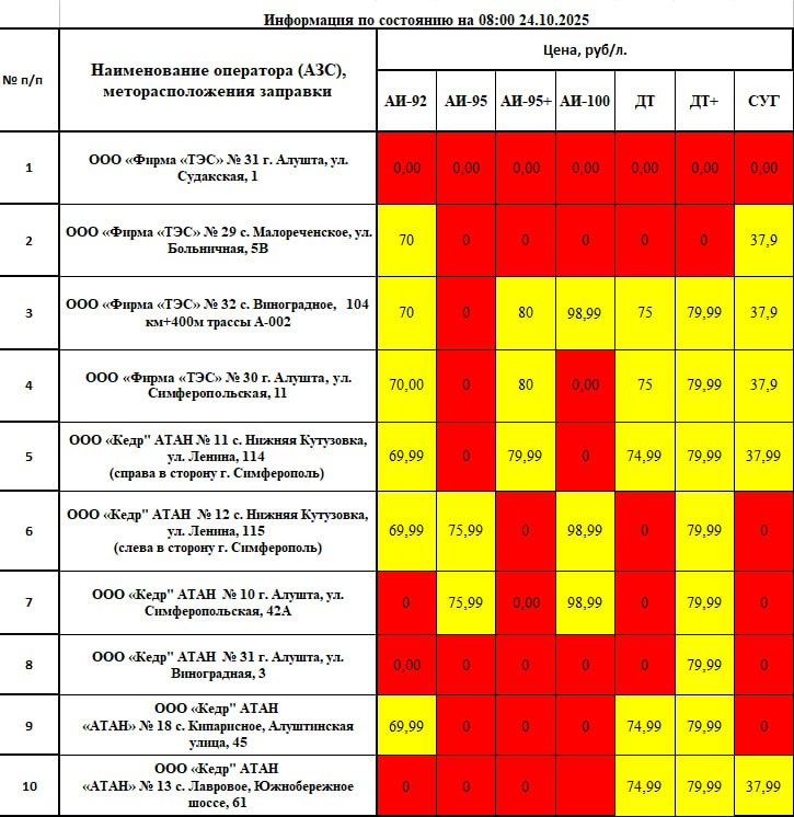 Уважаемые алуштинцы! Важная информация о наличии топлива в нашем муниципалитете по состоянию на 08:00 24.10.2025.