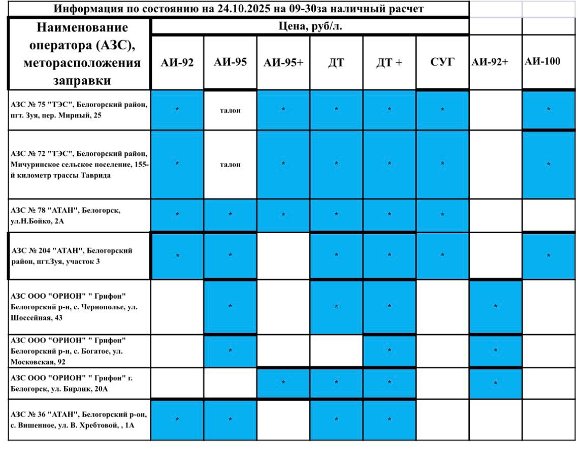 Актуальная информация по наличию топлива на АЗС в Белогорском районе по состоянию на 09.30 24 октября.