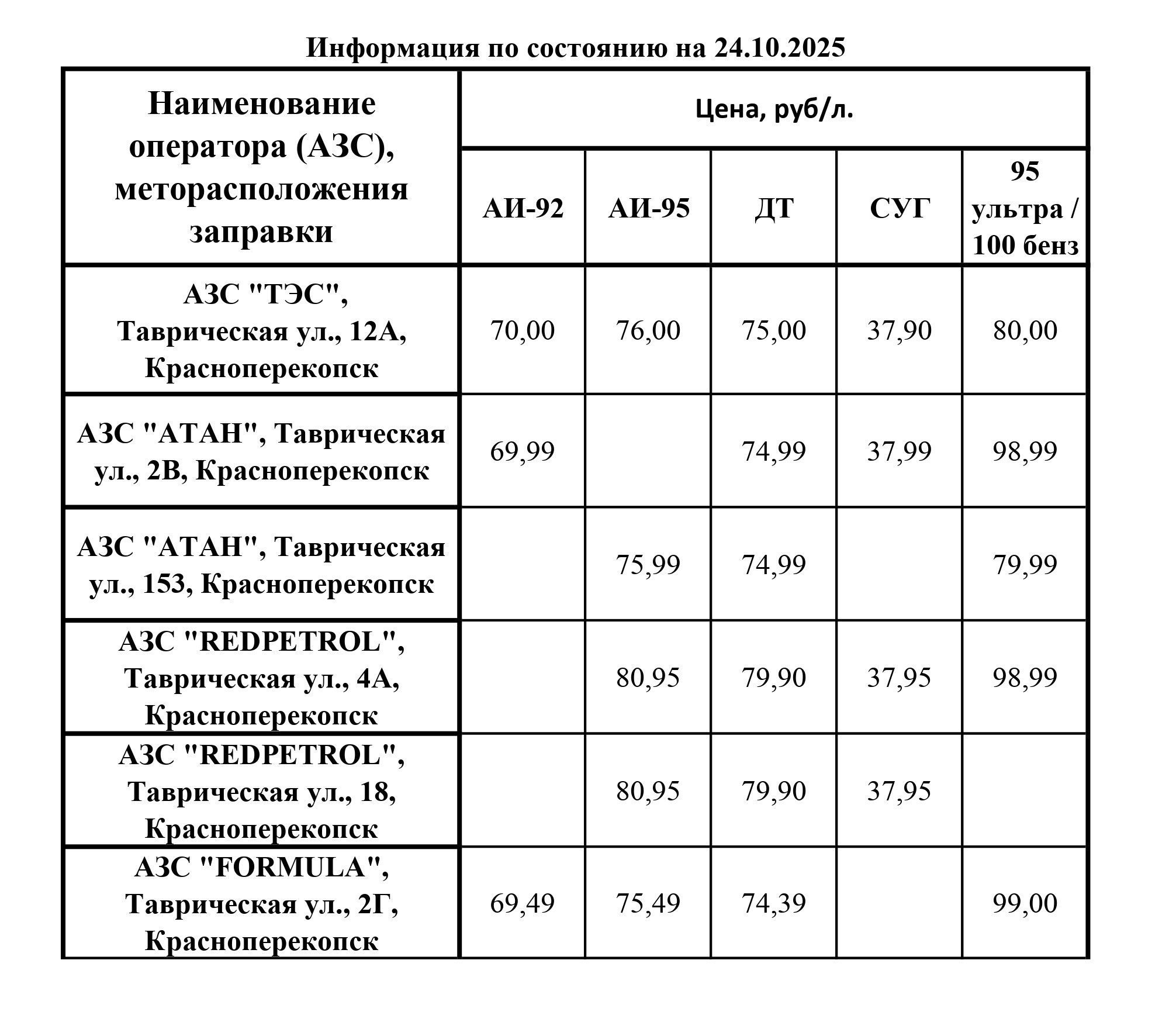 Актуальная информация о наличии топлива на АЗС города Красноперекопска на 24.10.2025 г