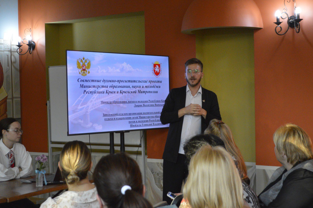 О совместной работе Министерства образования, науки и молодёжи Республики Крым и Крымской Митрополии в рамках реализации духовно-просветительских проектов рассказал заведующий отделом организации воспитательной работы, отдыха и оздоровления детей управления организации воспитательной работы, отдыха и оздоровления детей, профилактики экстремистской и террористической деятельности, правонарушений несовершеннолетних, безнадзорности и военно-патриотического воспитания – Геннадий Швейдель.
