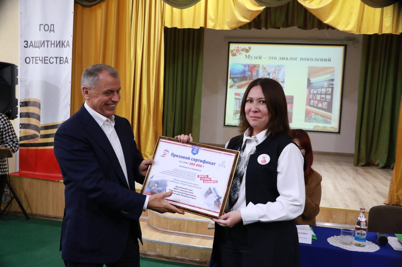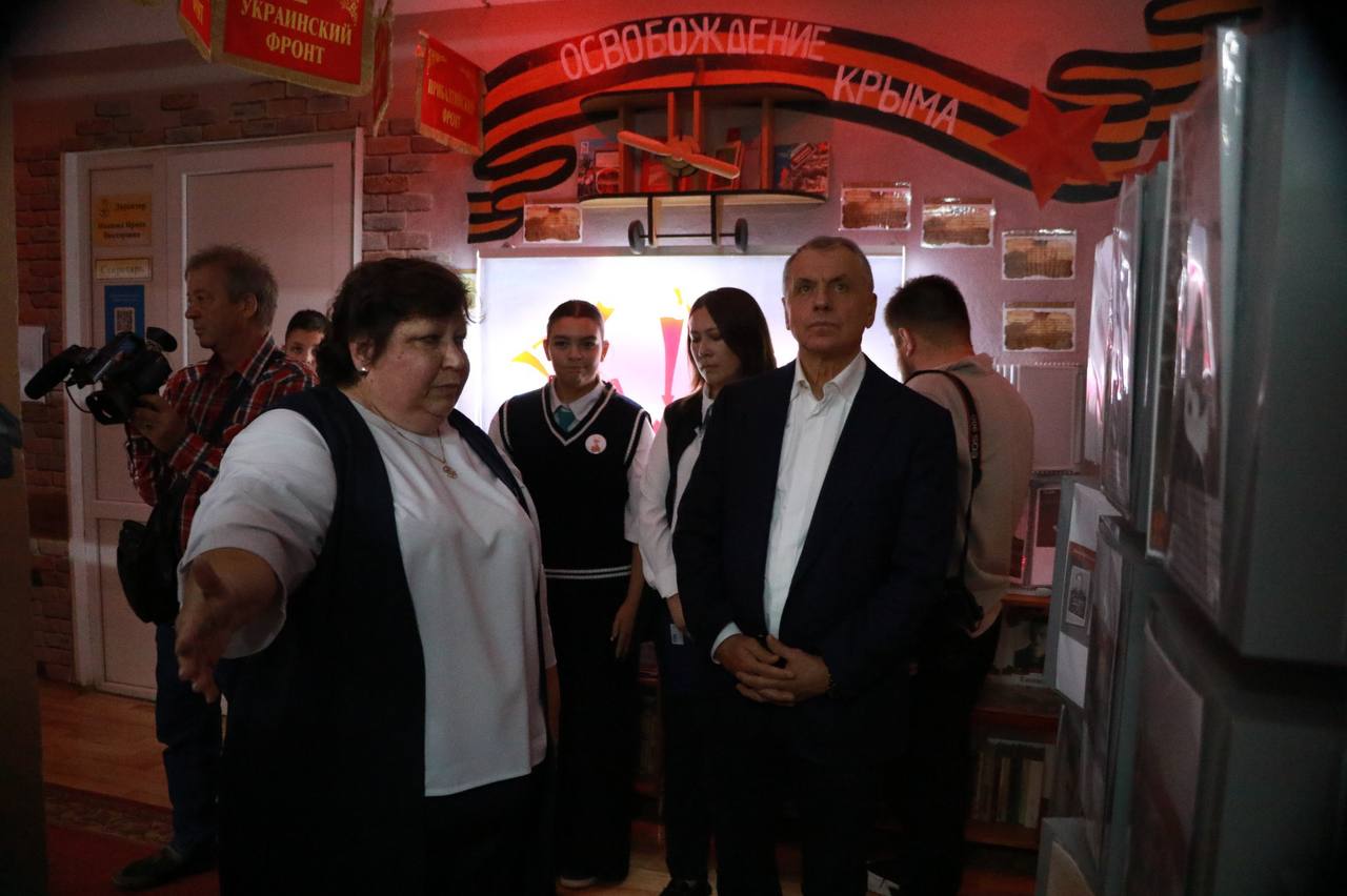 Финальным объектом рабочего визита Владимира Константинова стал осмотр музея Боевой славы в МБОУ «Гимназия им. Андреева Н.Р.» в г. Бахчисарай. Встретила участников поездки директор школы Ирина Иванова.