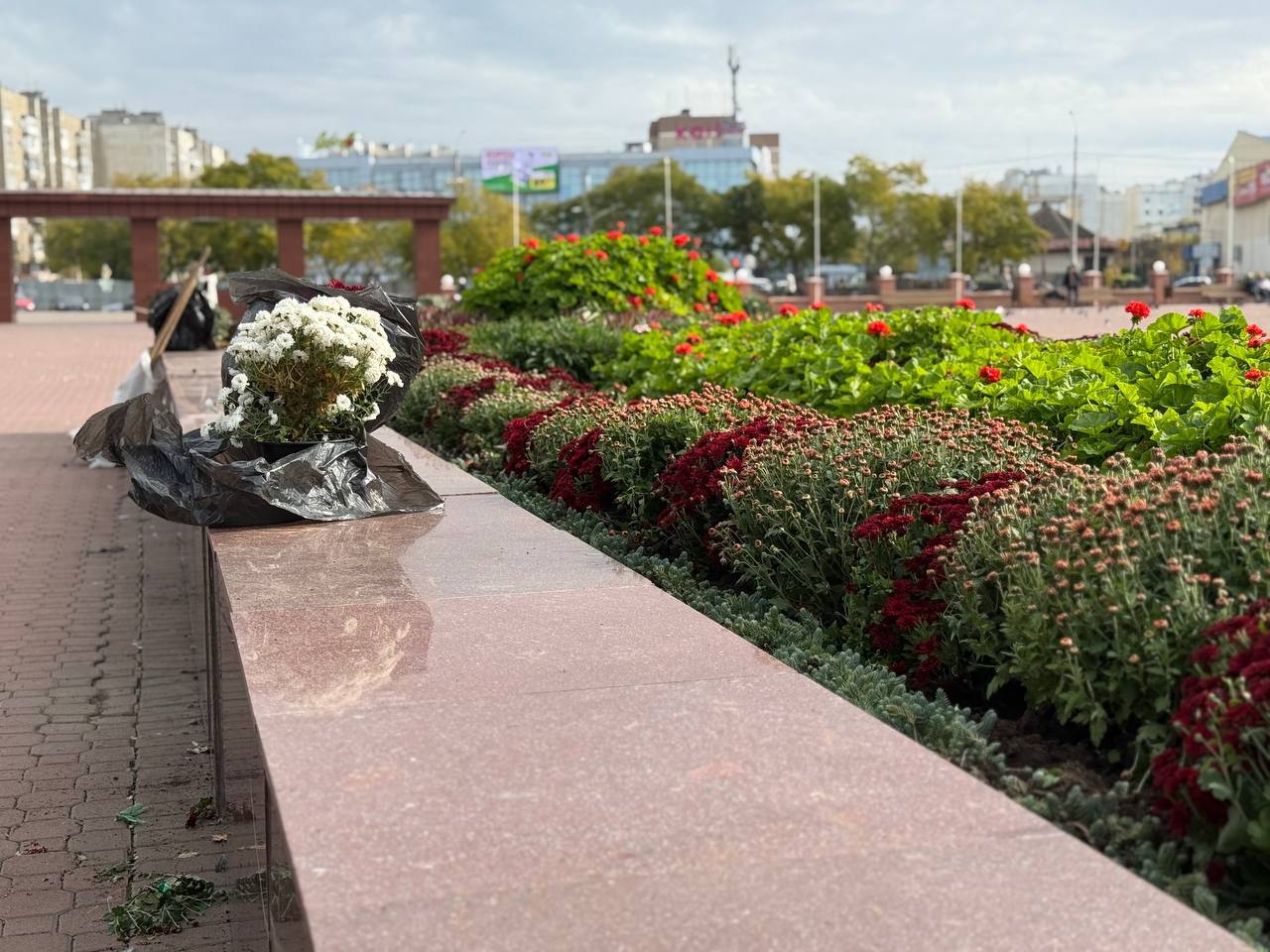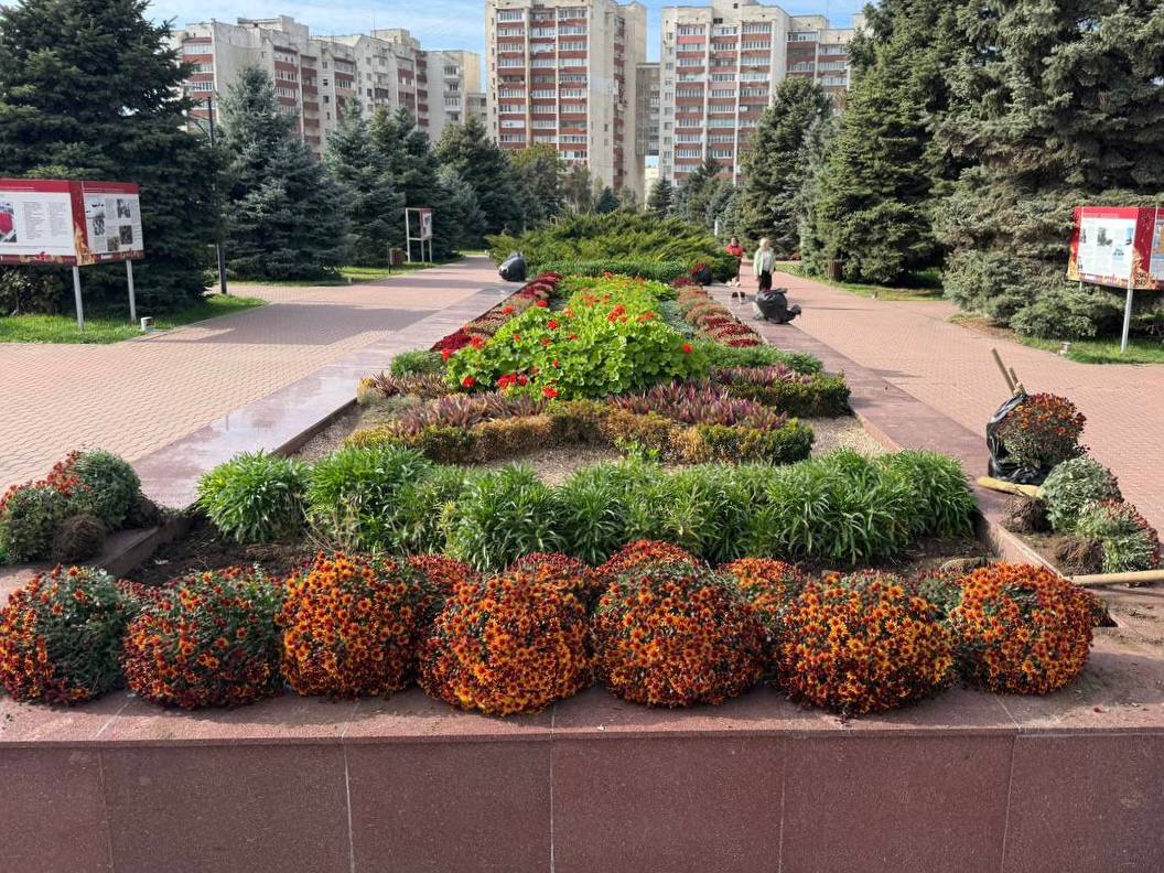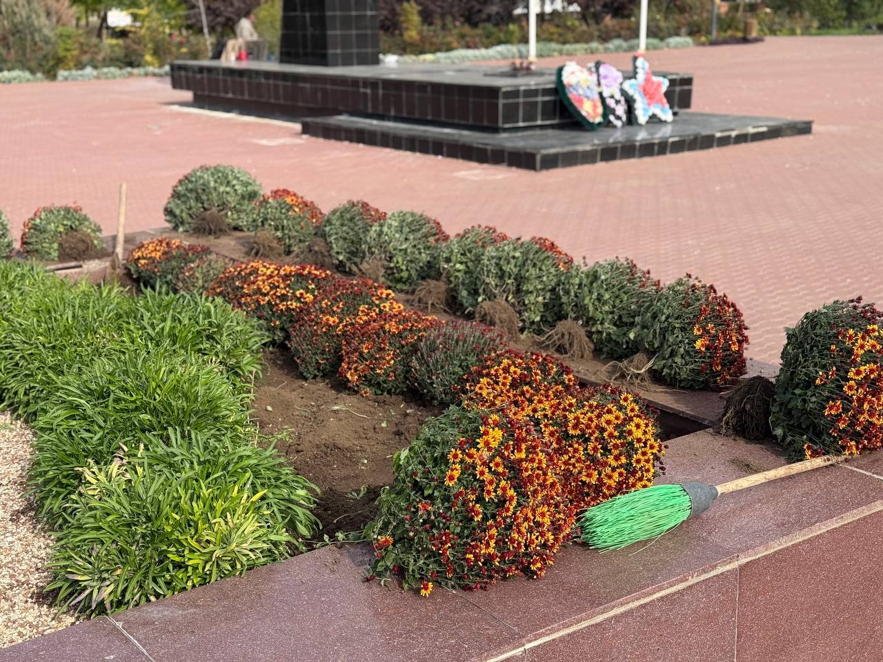 Специалисты МУП «МО «Комбинат благоустройства» высаживают хризантемы на мемориальном комплексе «Красная горка».