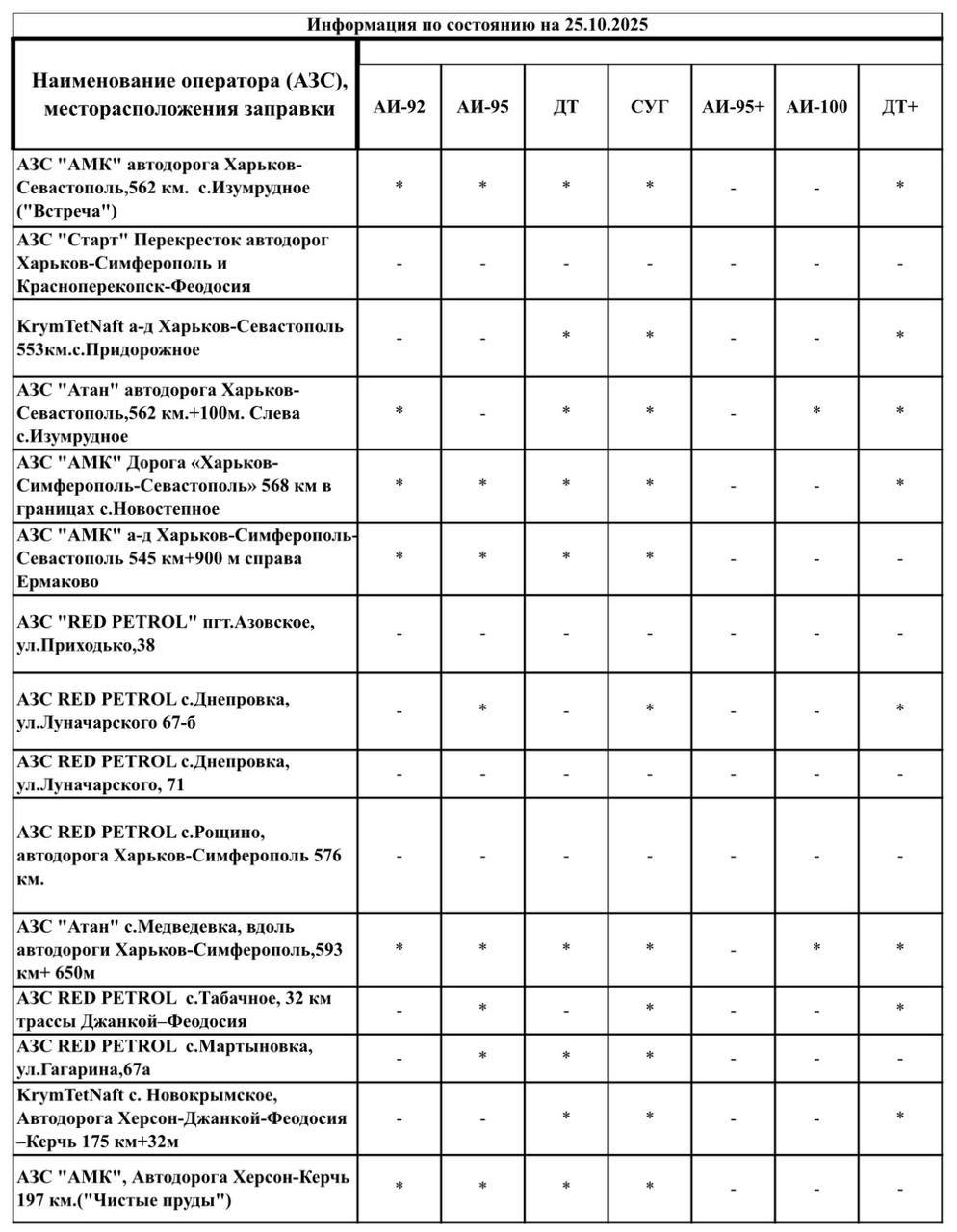 Поставки ведутся по распоряжению Министерства топлива и энергетики Республики Крым.Информация обновляется ежедневно. Актуальные данные о наличии топлива на АЗС Республики Крым размещены на портале Минтопэнерго Крыма по...