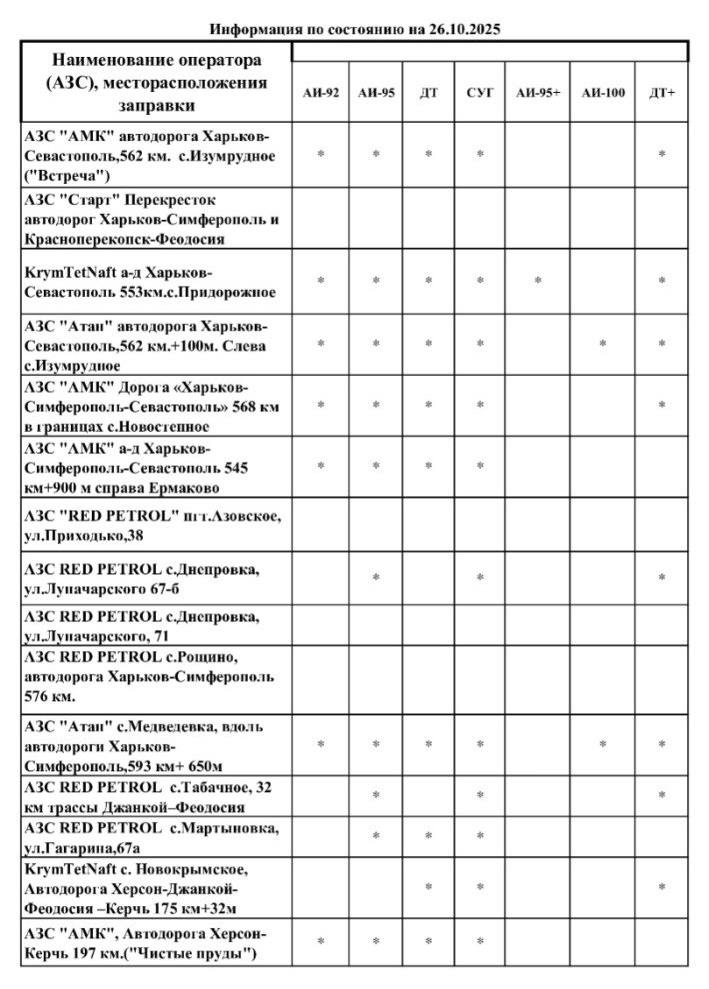 Поставки ведутся по распоряжению Министерства топлива и энергетики Республики Крым.Информация обновляется ежедневно. Актуальные данные о наличии топлива на АЗС Республики Крым размещены на портале Минтопэнерго Крыма по...