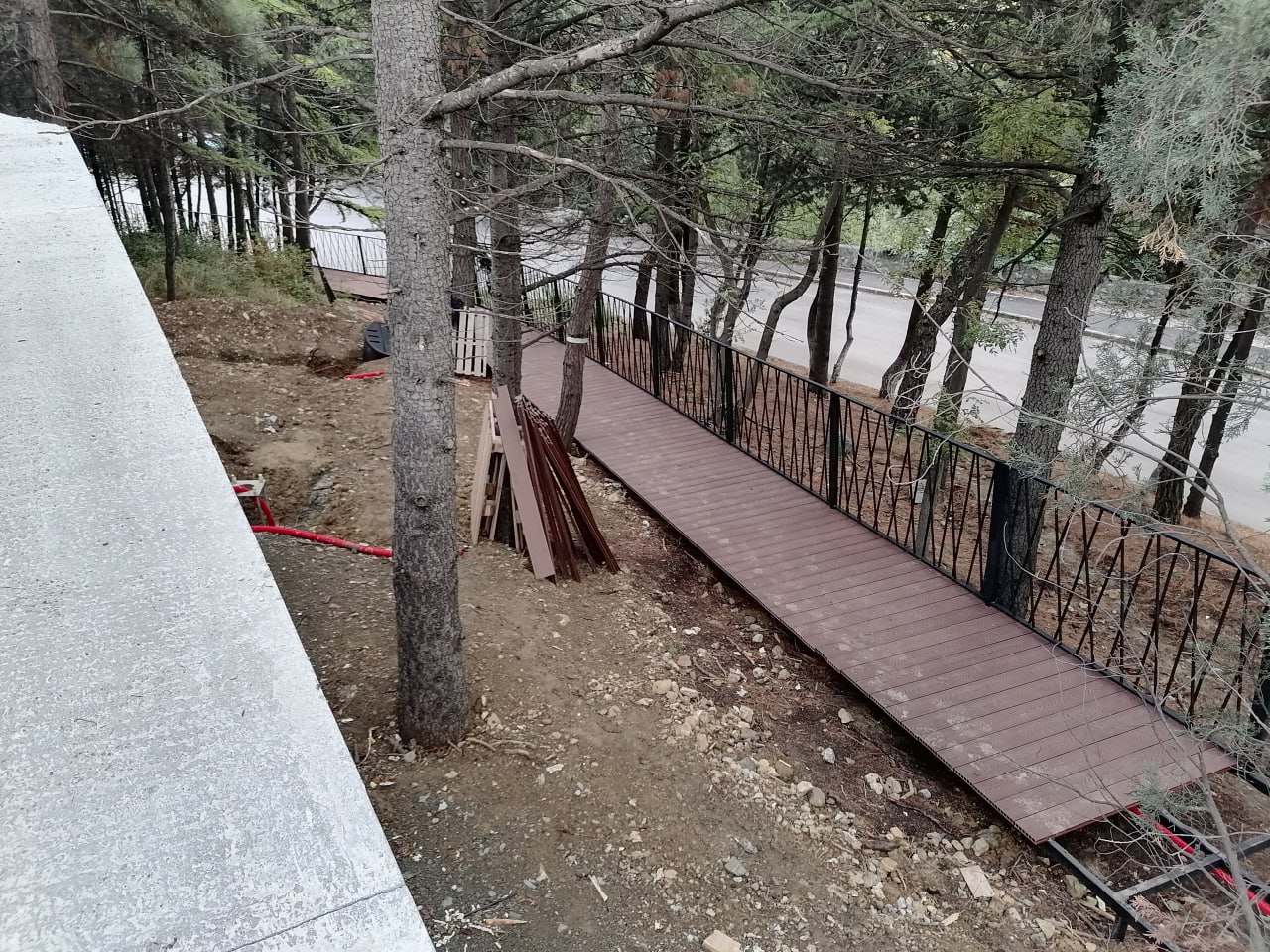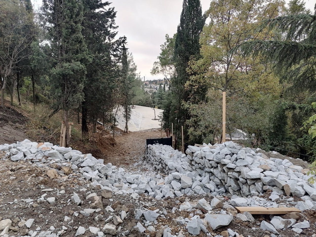 Дополнительно пришлось выполнить работы по прокладке инженерных сетей и монтажу подпорных стен, которых в связи с большим перепадом высот достаточно много.