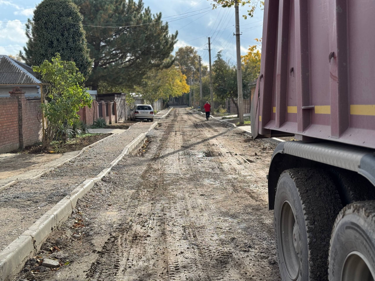 На ул. Сергея Лазо пока идут подготовительные работы. Твёрдого покрытия здесь не было долгие годы. Строители установили бордюры, обустроили по одной стороне дороги тротуар, отсыпали его щебнем. Теперь необходимо выполнить замену основания – снять небольшой слой грунта, отсыпать подушку из щебня, утрамбовать и затем уложить два слоя асфальта.