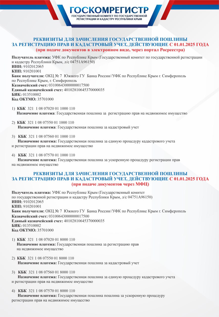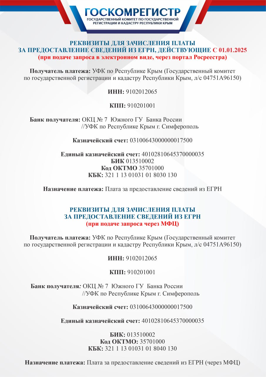 Информируем о небольшом изменении реквизитов для уплаты государственной пошлины за государственную регистрацию прав и кадастровый учет, а также реквизитов для зачисления платы за предоставление сведений из Единого государственного реестра недвижимости. В частности, в представленной информации изменилось название банка-получателя, остальные реквизиты остались прежними.
