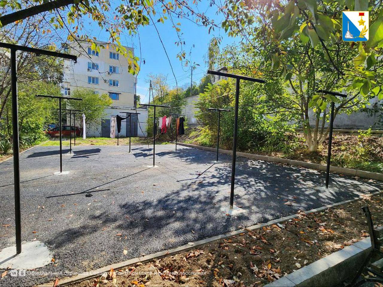 На территории обустроили современную зону для сушки белья с 12 стойками, установили 4 скамейки и заасфальтировали парковочную зону.