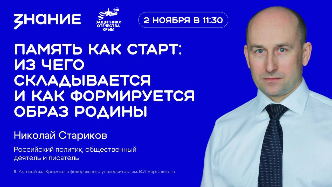 Фонд «Защитники Отечества» и общество «Знание» приглашают 2 ноября в 11.30 на встречу с известным российским политиком, общественным деятелем и писателем Николаем Стариковым, чьи выступления отличает актуальность выбранных тем. Мероприятие пройдет в актовом зале Крымского федерального университета им. В.И. Вернадского