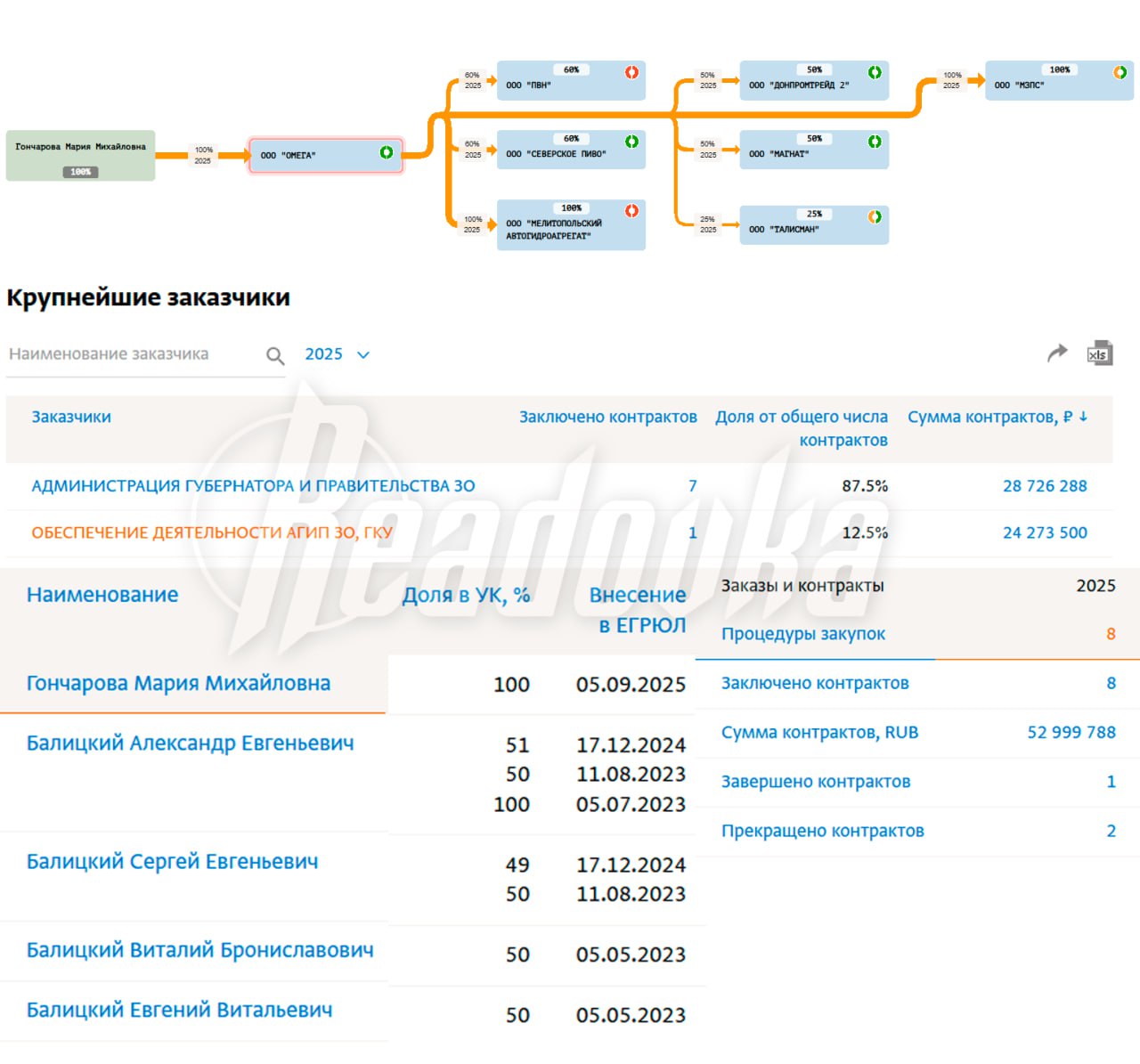 Еще при прежних владельцах «Омега» выполняла контракты администрации Балицкого. Всего за 2025 год компания, как единственный поставщик, получила заказов почти на 53 млн. «Омега» также учредила ряд «дочек» и ИП — всего семь. Они занимаются разными направлениями: от пивоварения и гостиничного бизнеса до производства автодеталей и продуктов питания. Например, ООО «Магнат», работающее в сфере гостиниц, старший сын Александр покинул только в этом году. Данных о доходах компании нет, однако только налогов она заплатила 2,2 млн за 2024.