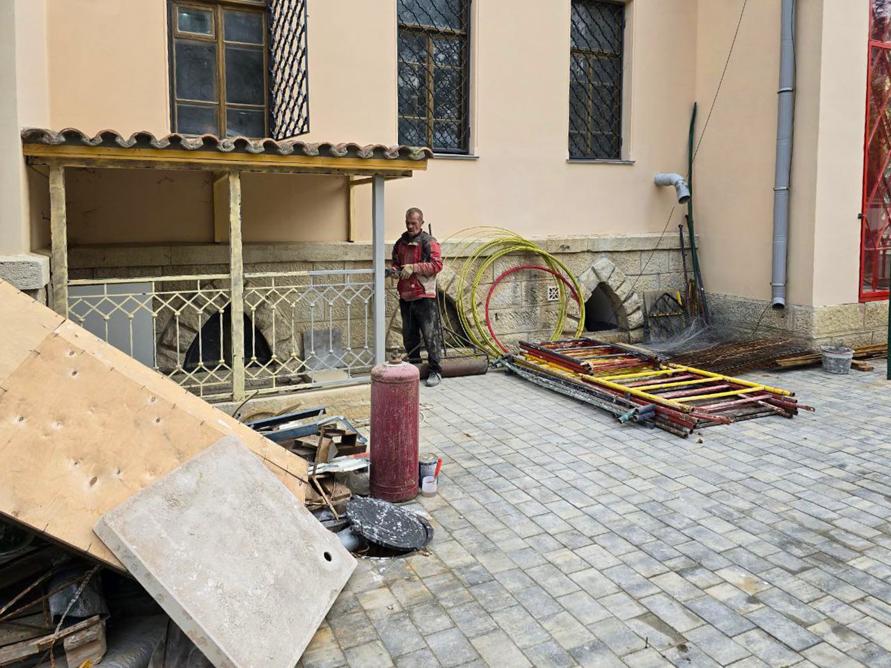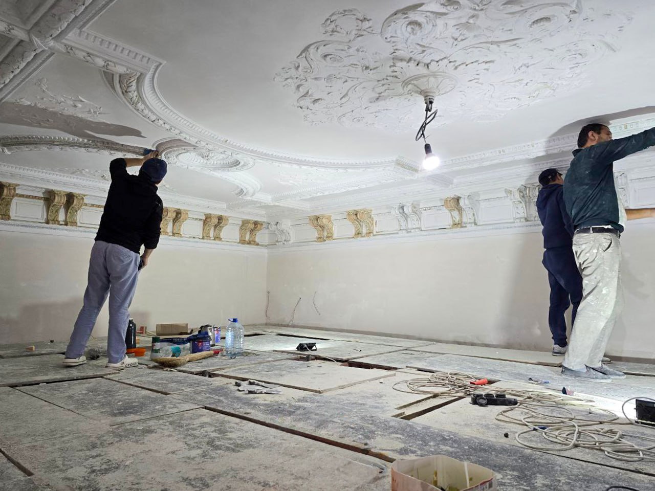 Сейчас ведутся отделочные работы, восстанавливают полы и двери, а также воссоздают мраморную облицовку портала главного входа.