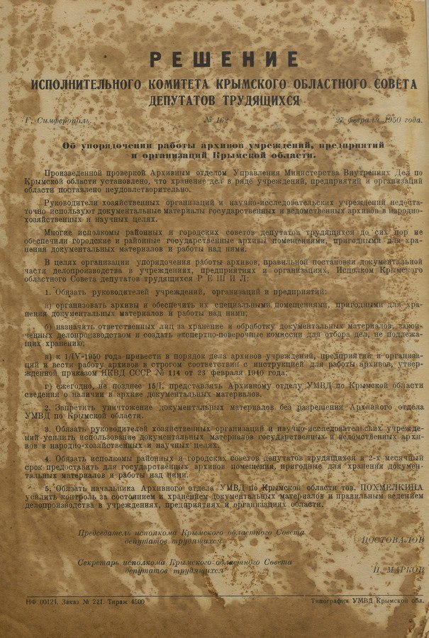 Государственный архив Республики Крым продолжает публикацию документов, которые освящают интересные страницы крымской истории. Вашему вниманию представляется решение Исполнительного комитета Крымского областного Совета депутатов трудящихся № 162 от 27 февраля 1950 года «Об упорядочении работы архивов учреждений, предприятий и организаций Крымской области».