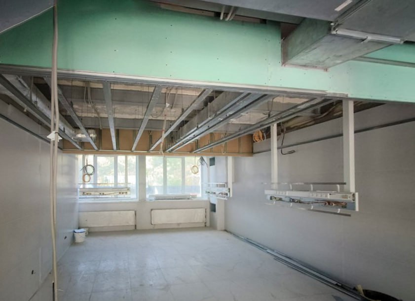 Почти полностью выполнены кровельные и фасадные работы, смонтированы системы водоснабжения, канализации и вентиляции. Сейчас специалисты занимаются отделкой помещений и прокладкой коммуникаций.