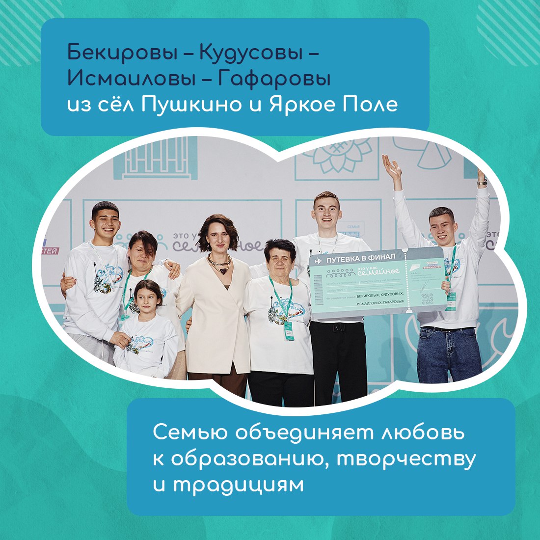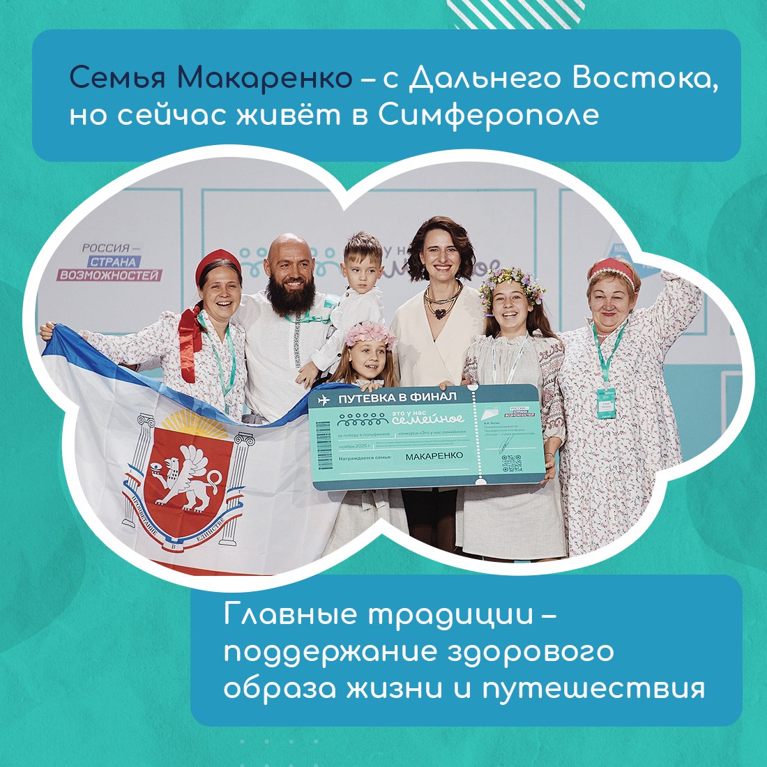 Финалистов определили по итогам оценочных испытаний. Участники выполняли интеллектуальные, спортивные и творческие задания. Крым в финале представят две семьи: Бекировых – Кудусовых – Исмаиловых – Гафаровых и Макаренко. Летом финалисты отправятся в Москву, чтобы побороться за главные призы – сертификаты на улучшение жилищных условий.