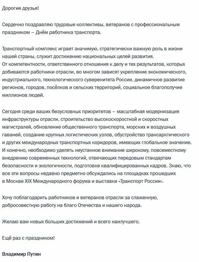 Президент РФ Владимир Путин поздравил работников и ветеранов транспортной отрасли с Днем работника транспорта