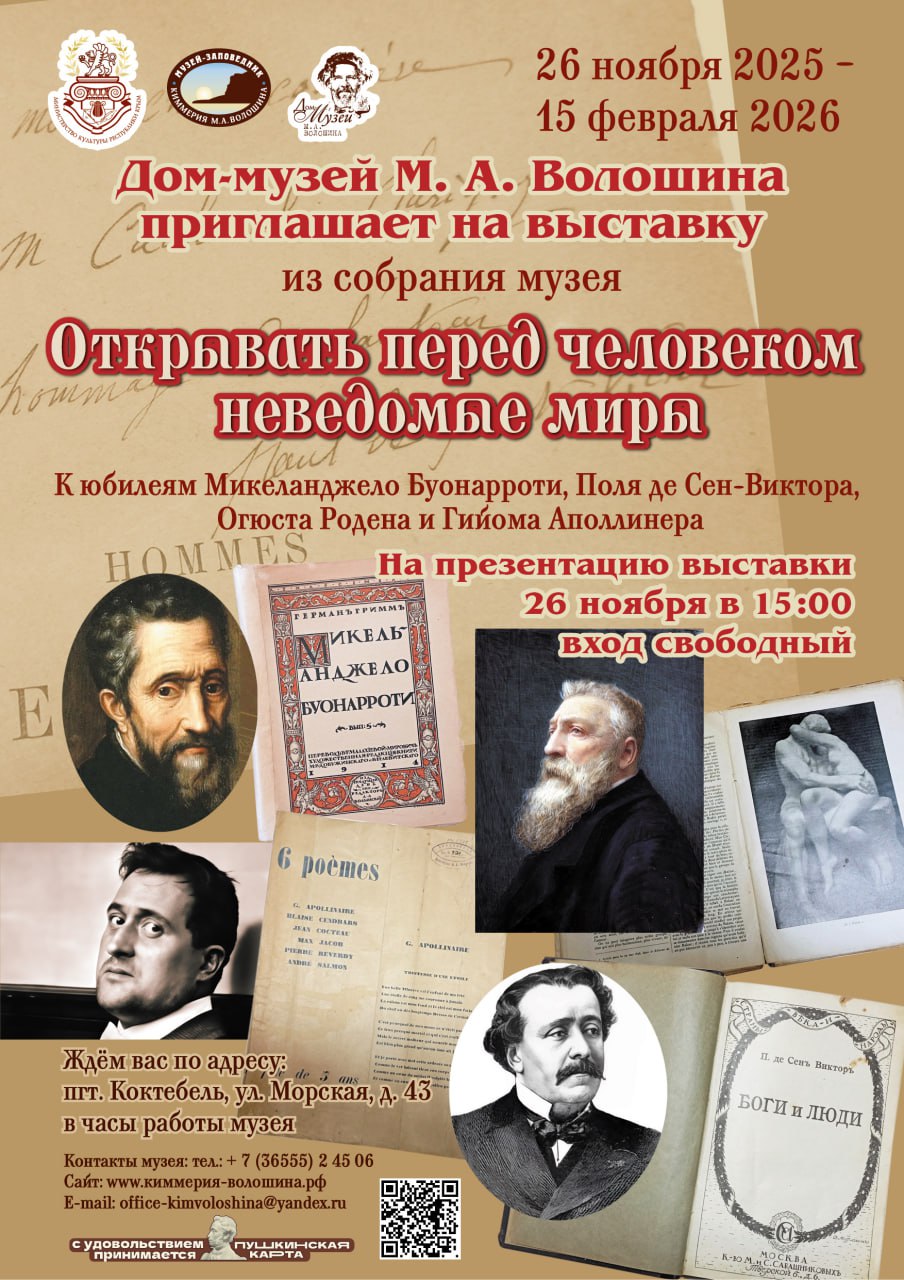 В Доме-музее М. А. Волошина 26 ноября в 15:00 состоится презентация выставки «Открывать перед человеком неведомые миры», посвящённая юбилеям писателей Микеланджело Буонарроти, Поля де Сен-Виктора, Огюста Родена, Гийома Аполлинера.