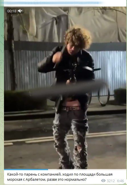 Видео правоохранители обнаружили в соцсетях. Парень разгуливал с оружием по улице Большая Морская и стрелял. Кроме того, он направлял арбалет в сторону стоящего рядом человека.