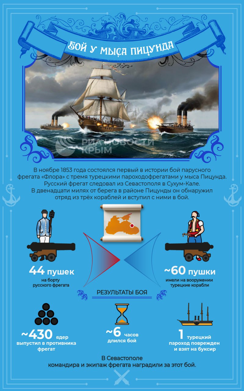 В ноябре 1853 года у мыса Пицунда русский пушечный фрегат "Флора" встретился с тремя турецкими пароходофрегатами.