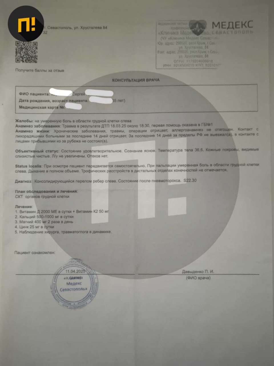 Мою знакомую и меня увезли в больницу на скорой. У нас тяжкие телесные повреждения. У меня три ребра сломано, ушиб грудной клетки, ушиб левого лёгкого, пневмоторакс, делали операцию, ставили дренаж, выкачивали жидкость с лёгкого. У моей знакомой то же самое, только у неё шесть рёбер сломано. Лечение было свыше 21 дня. Месяцев четыре-пять я чувствовал рёбра, первые два месяца было совсем жёстко: ни вдохнуть, ни выдохнуть».