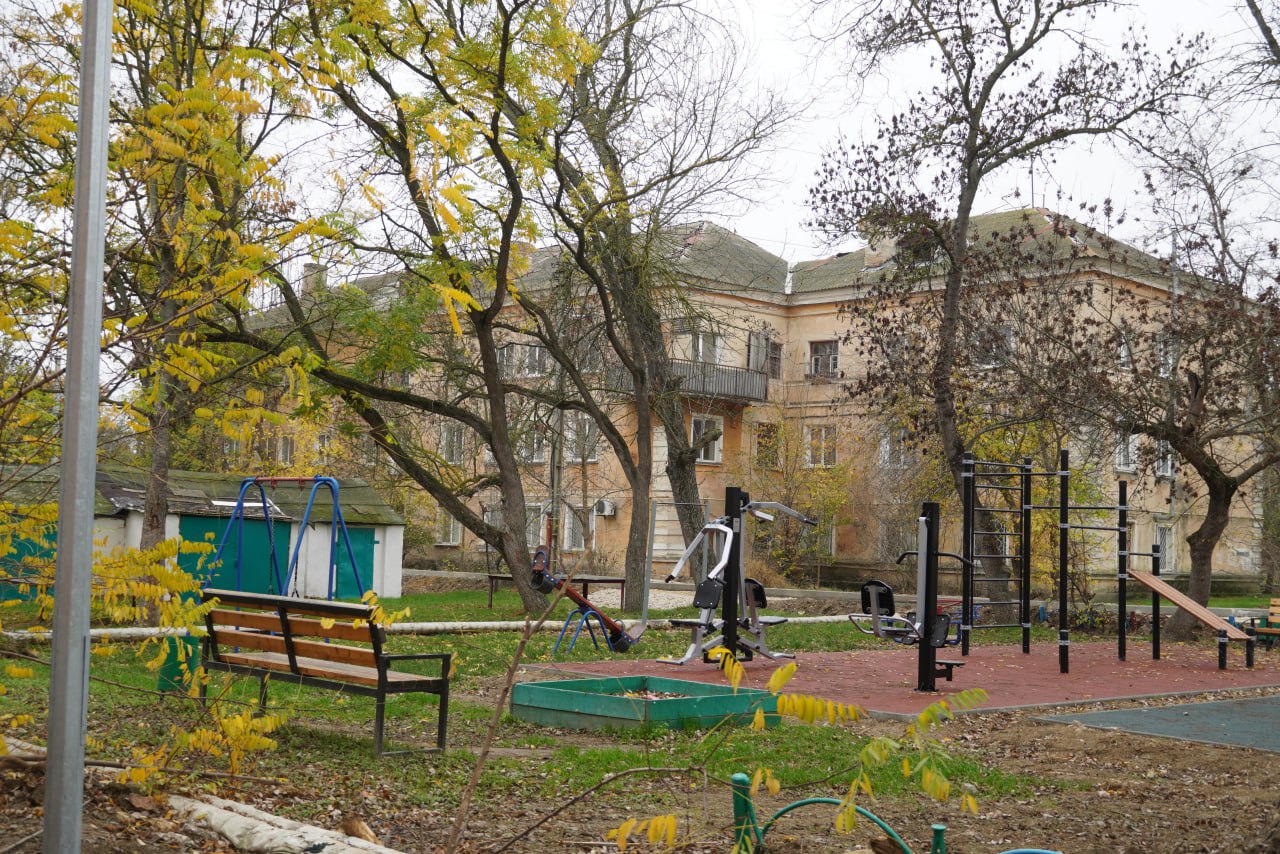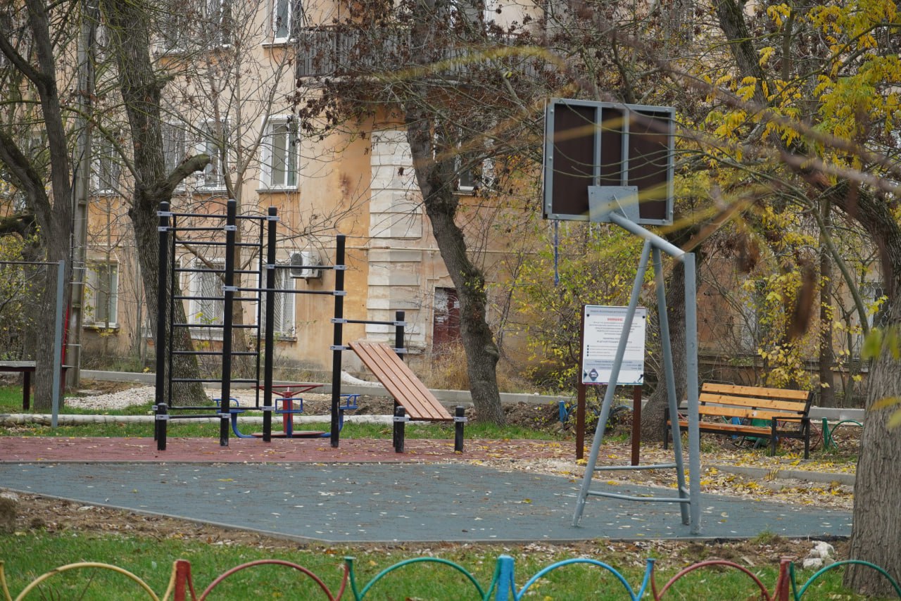 Во дворе установлено спортивное оборудование, о чем просили жители. Смонтирована баскетбольная стойка, тренажеры, другие элементы для занятий физической культурой, уложено резиновое покрытие. Для отдыха и развлечений маленьких жителей сохранены игровые конструкции.